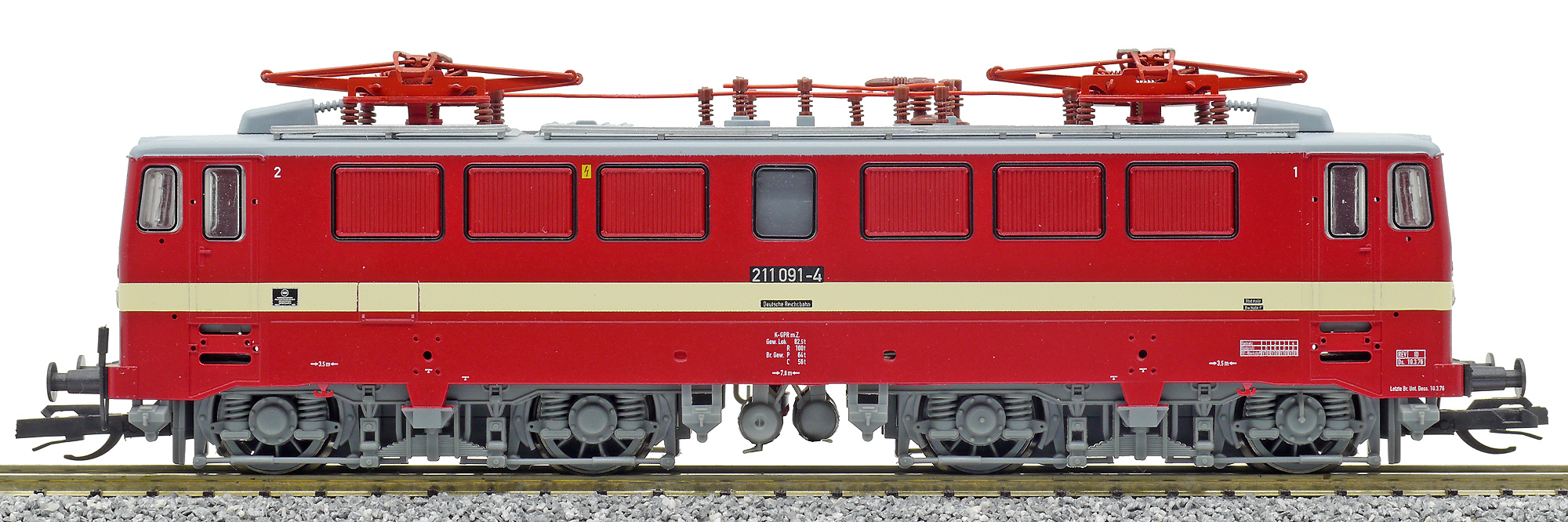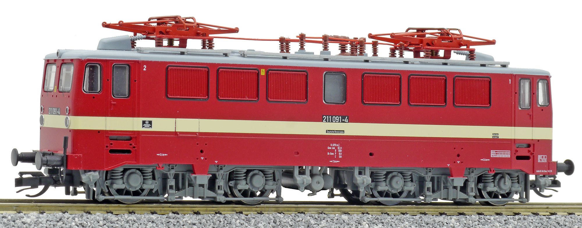 Popis   elektrická lokomotiva červená s krémovým pruhem a šedými podvozky