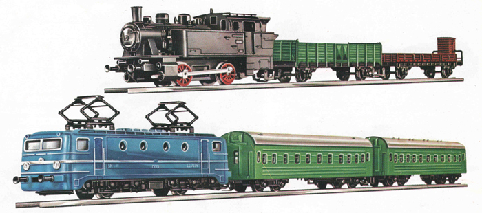 | dvojitý set elektrické lokomotivy s rychlíkem a parní lokomotivy s nákladním vlakem |
