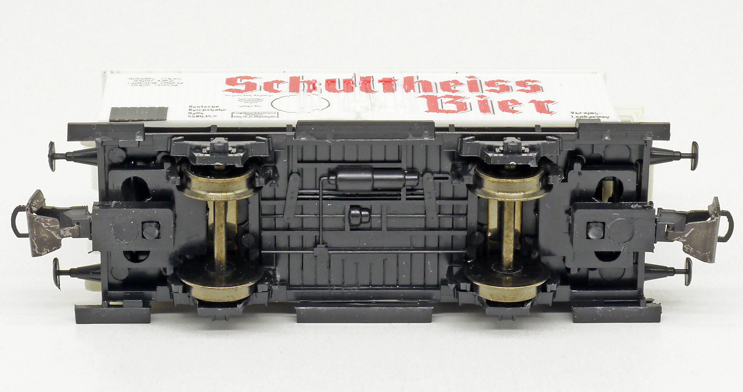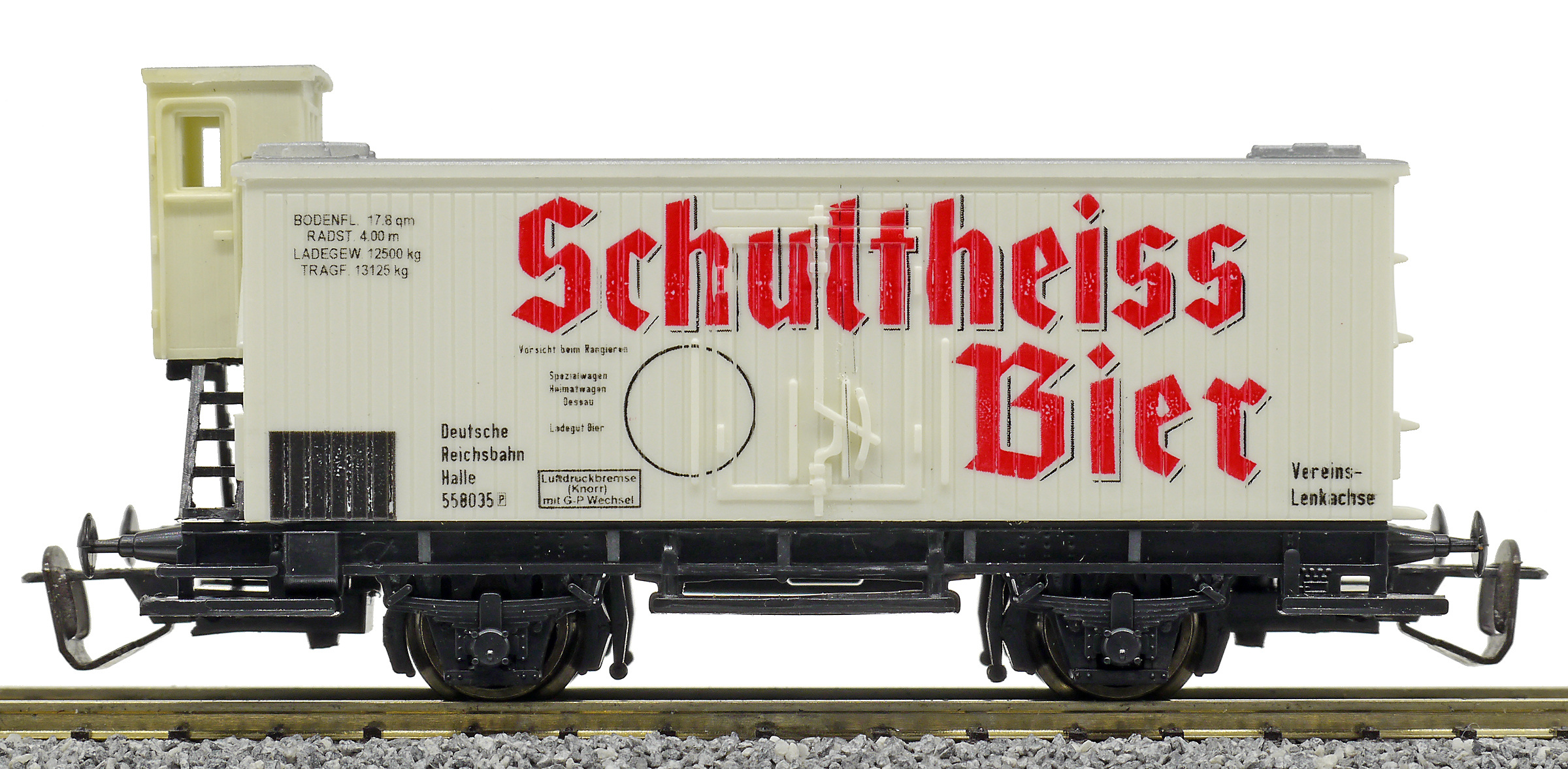 | nákladní chladící vůz bílý s šedou střechou a brzdařskou budkou „Schultheiss Bier“ |