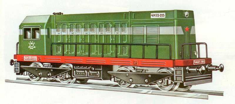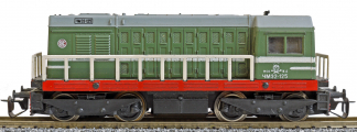 dieselová lokomotiva zelená s červeným rámem a černým pojezdem