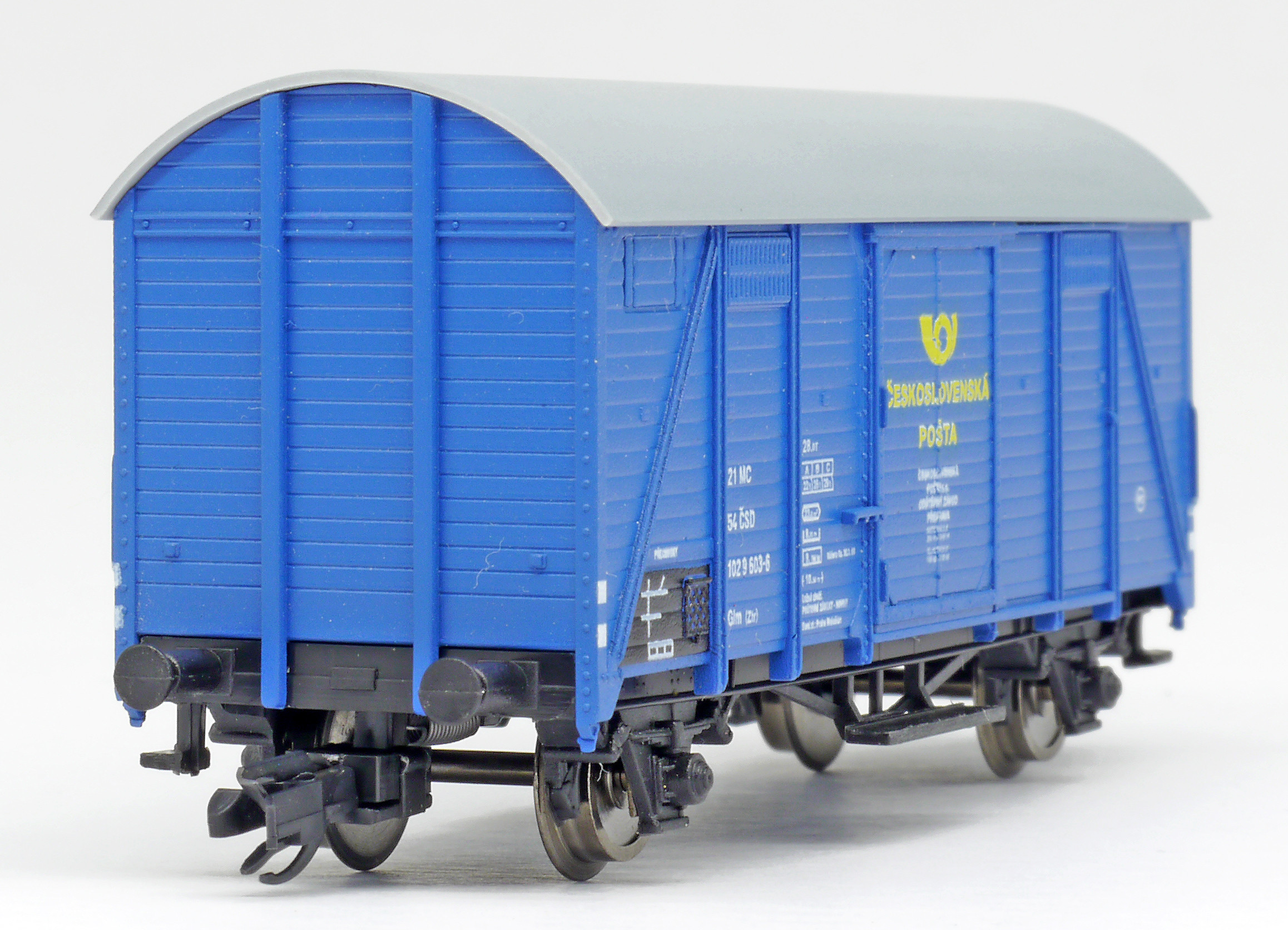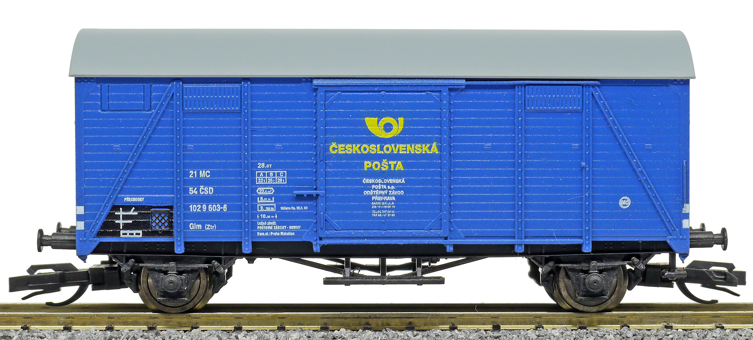 | krytý nákladní vůz modrý s šedou střechou „Československá pošta - Praha” |