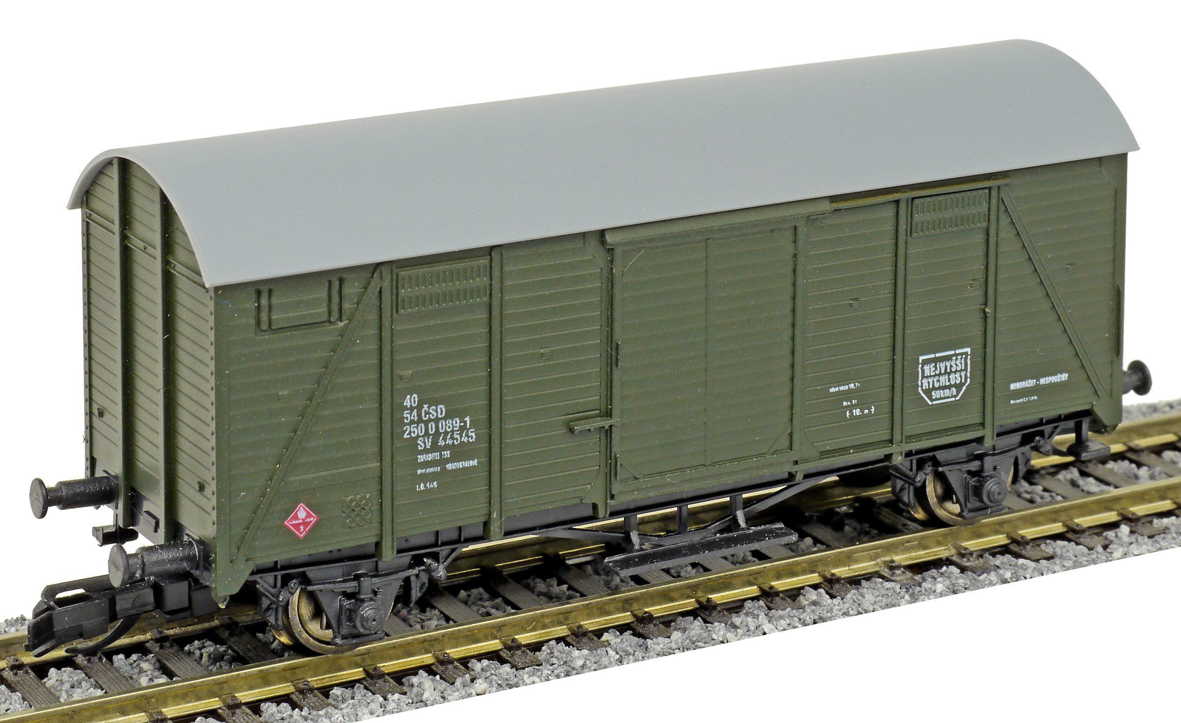 | krytý nákladní vůz zelený s šedou střechou do pracovního vlaku SV 44545 |