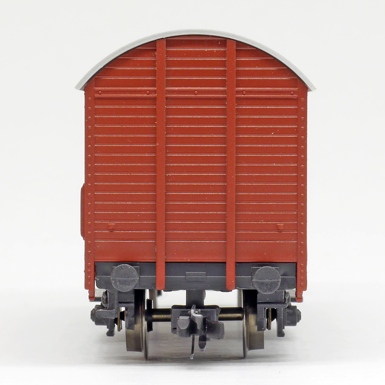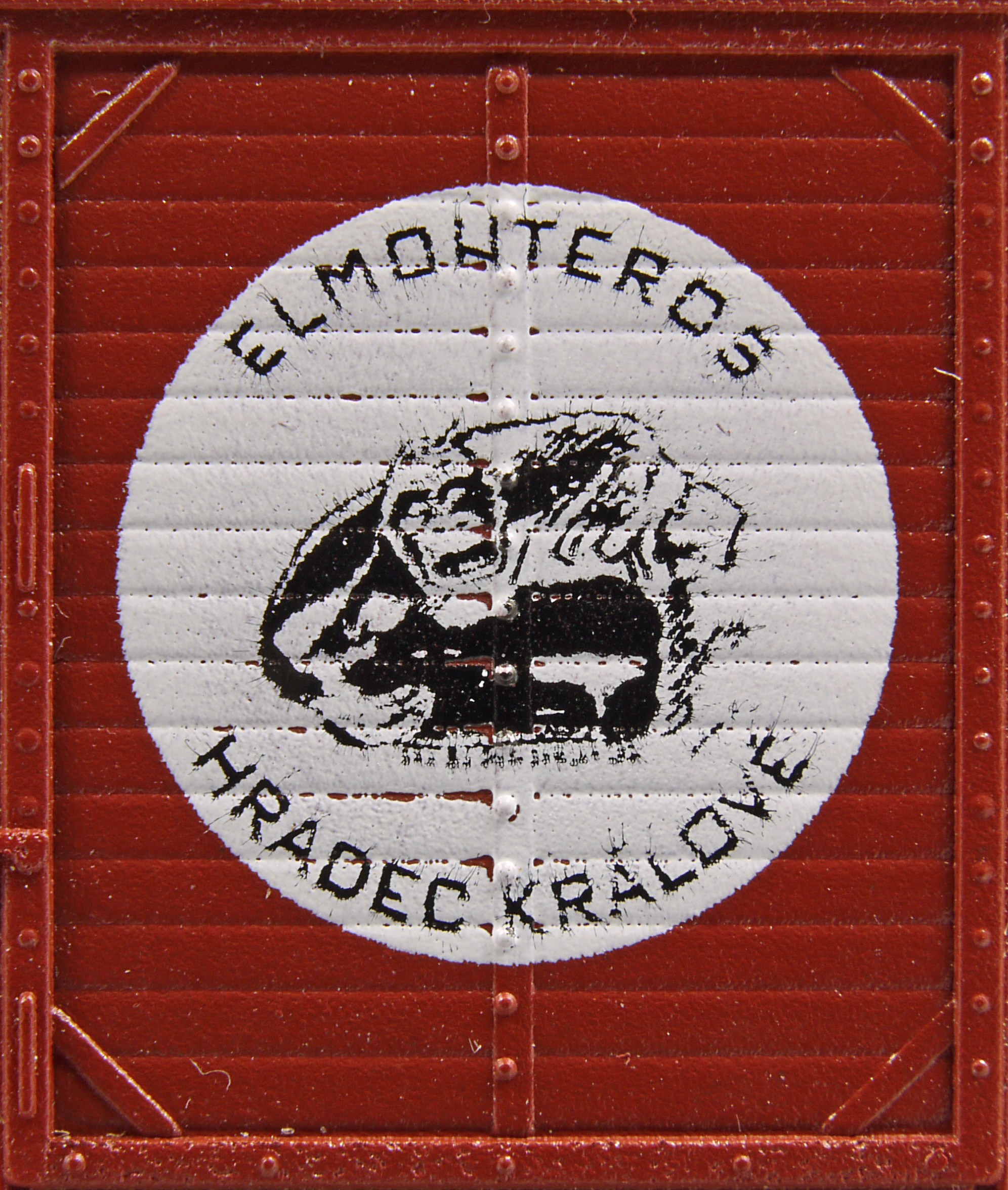 | krytý nákladní vůz červenohnědý s šedou střechou do pracovního vlaku „Elmonteros”, logo opice |