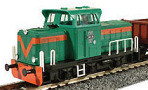 | dieselová lokomotiva zelená-oranžová s černým rámem a pojezdem |