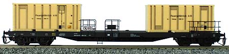 | nákladní plošinový vůz černý s nákladem dvou mobilních buněk |
