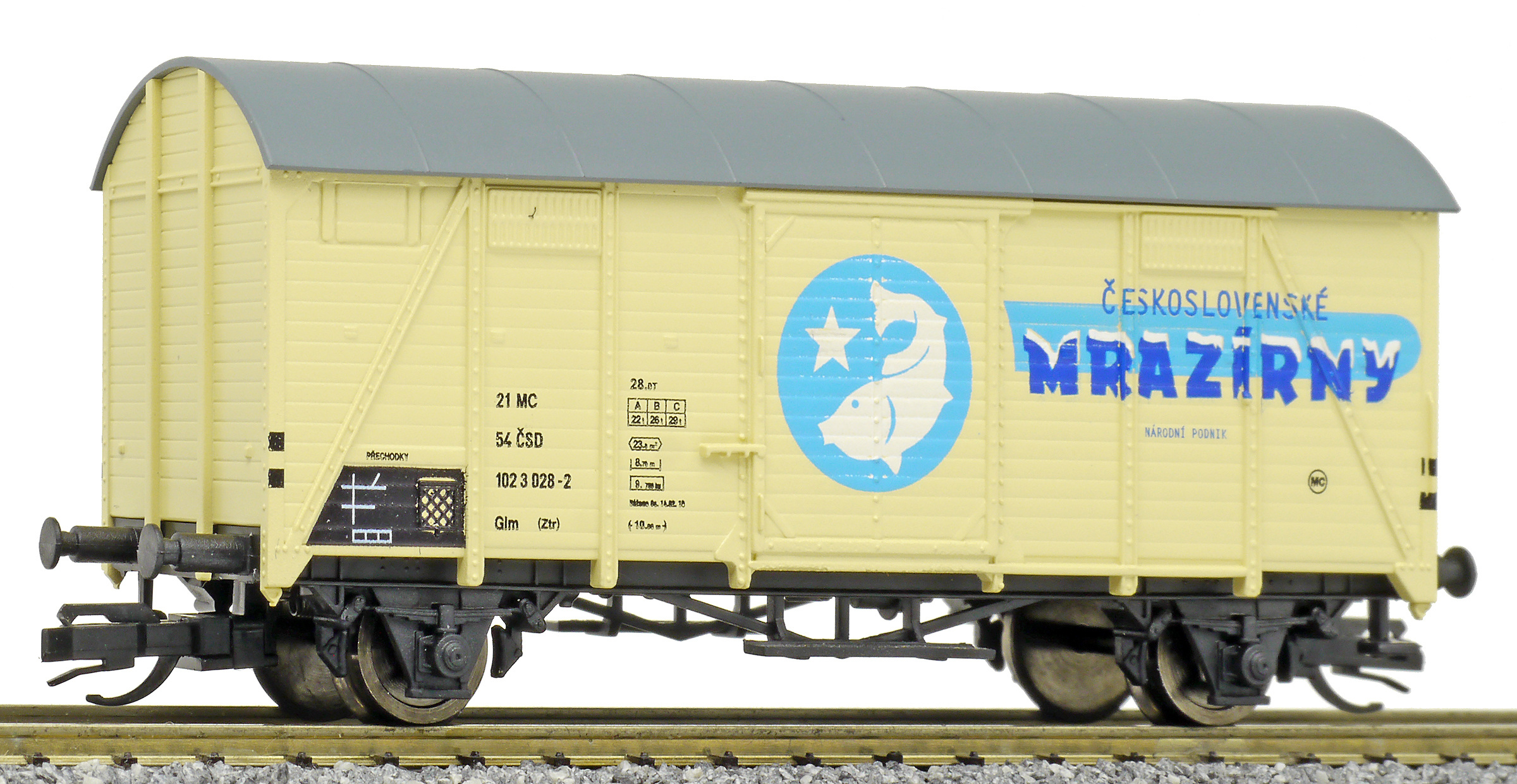 | krytý nákladní vůz krémový s šedou střechou „Mrazírny“, logo ryba |