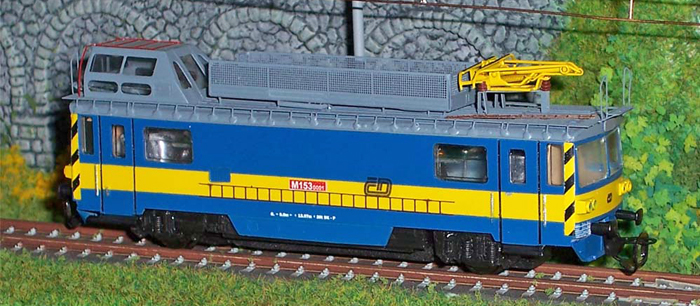motorový vůz na opravu vrchního vedení modrý s výstražným žlutým pruhem