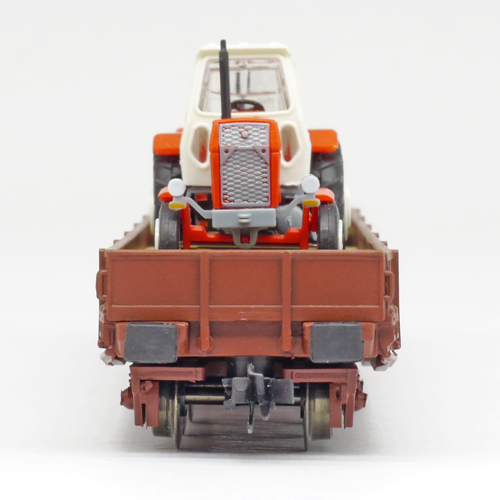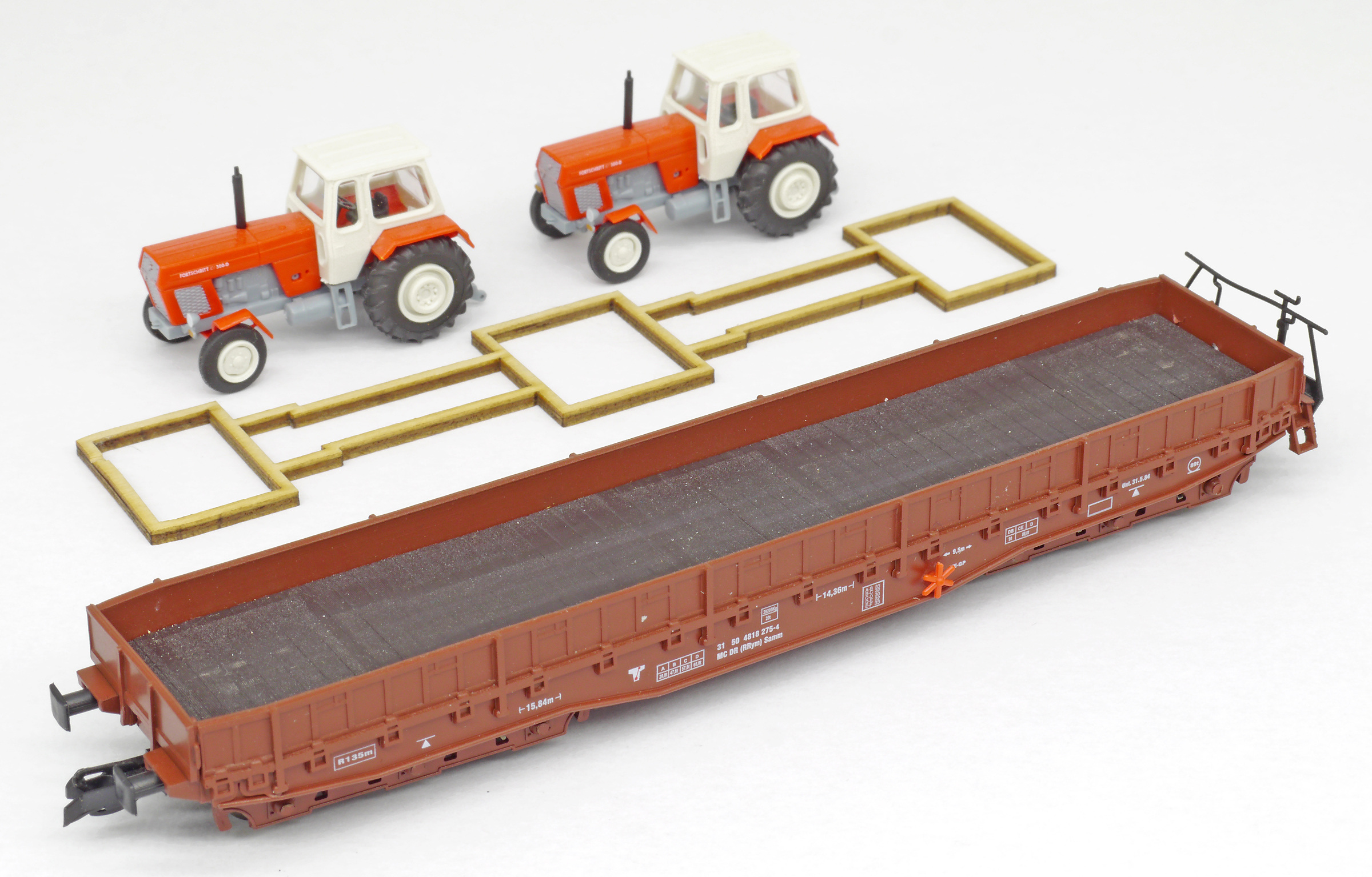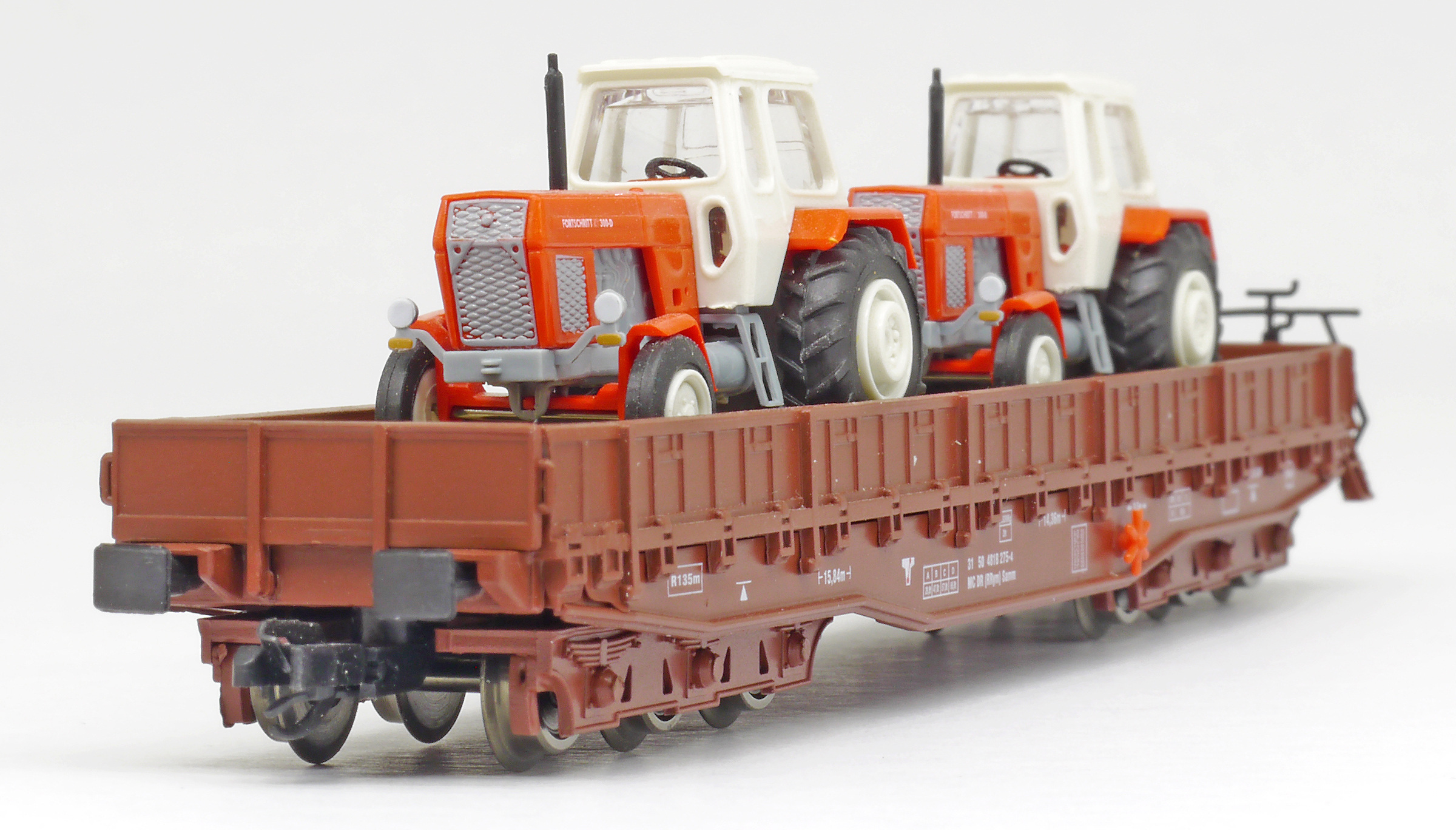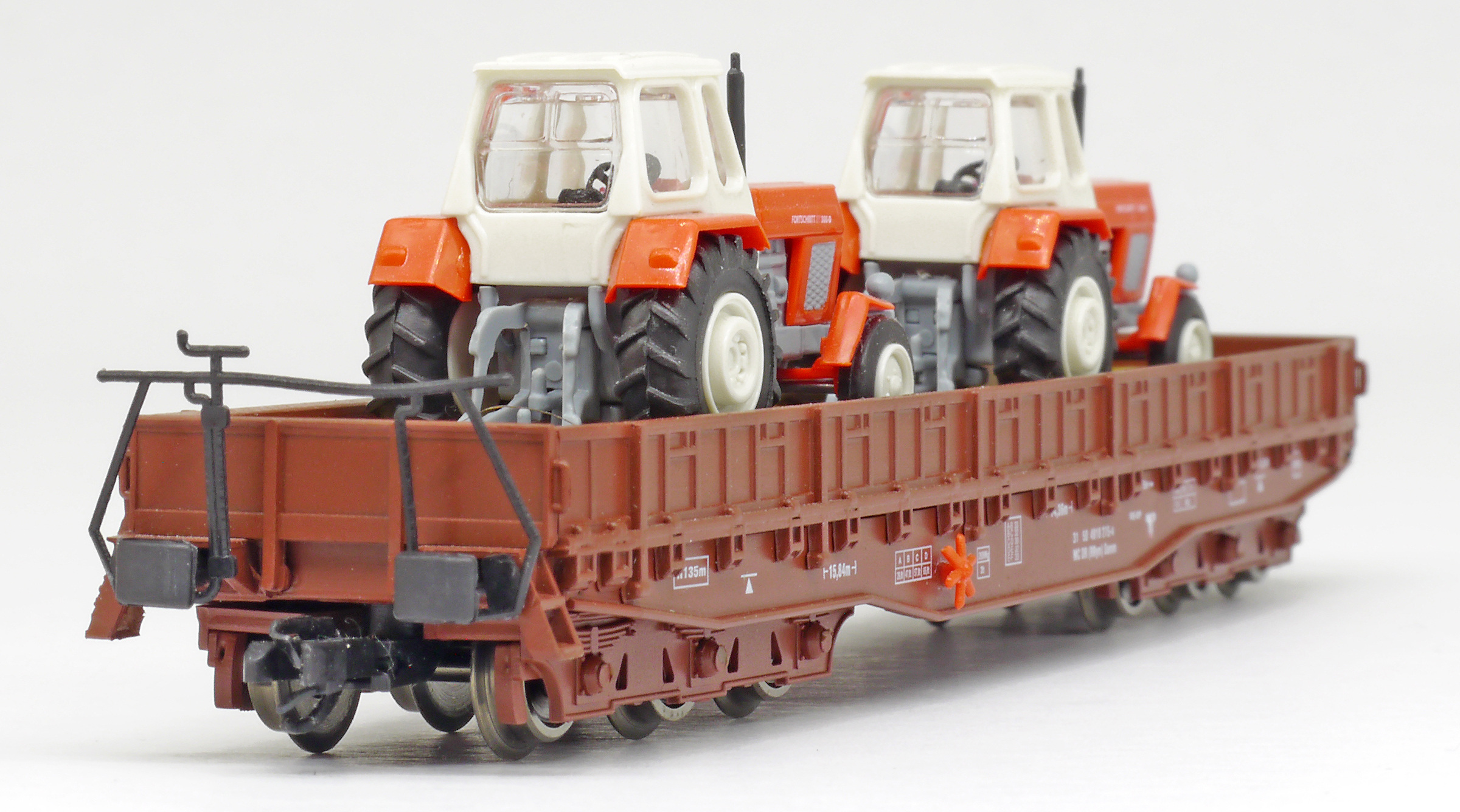 | nízkostěnný nákladní vůz červenohnědý s nákladem dvou traktorů ZT 300 |
