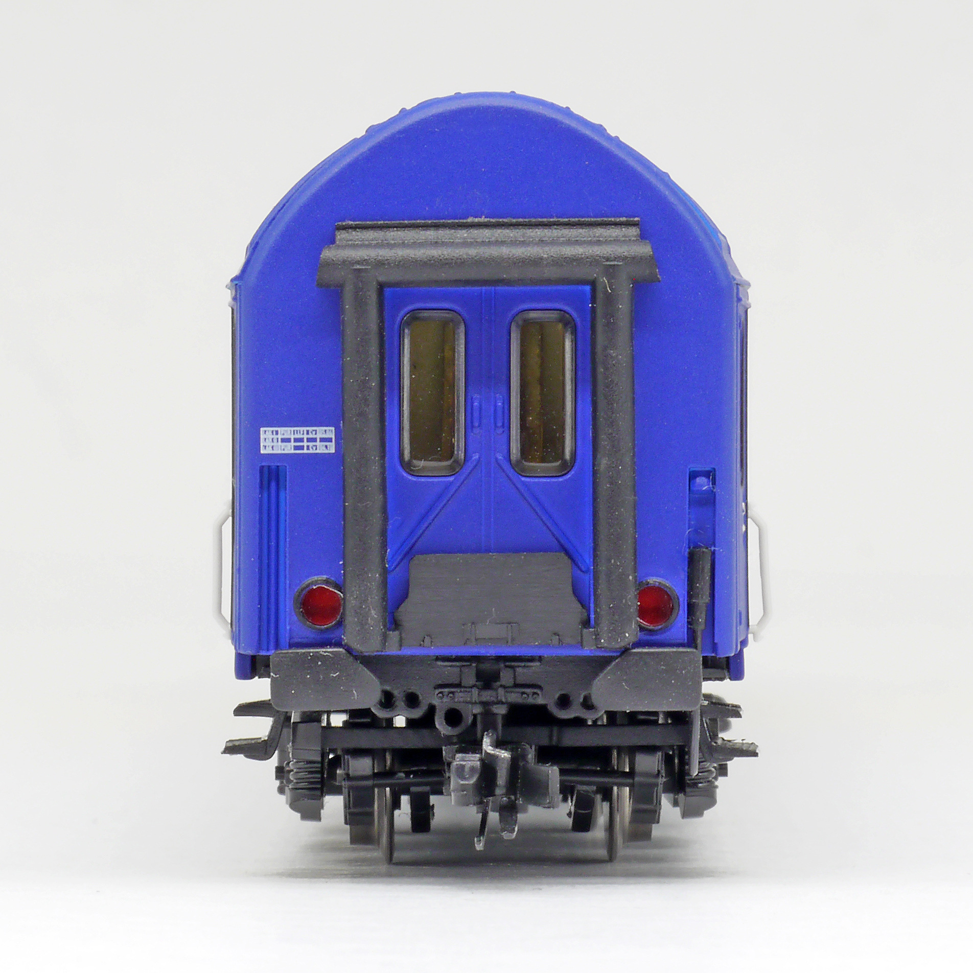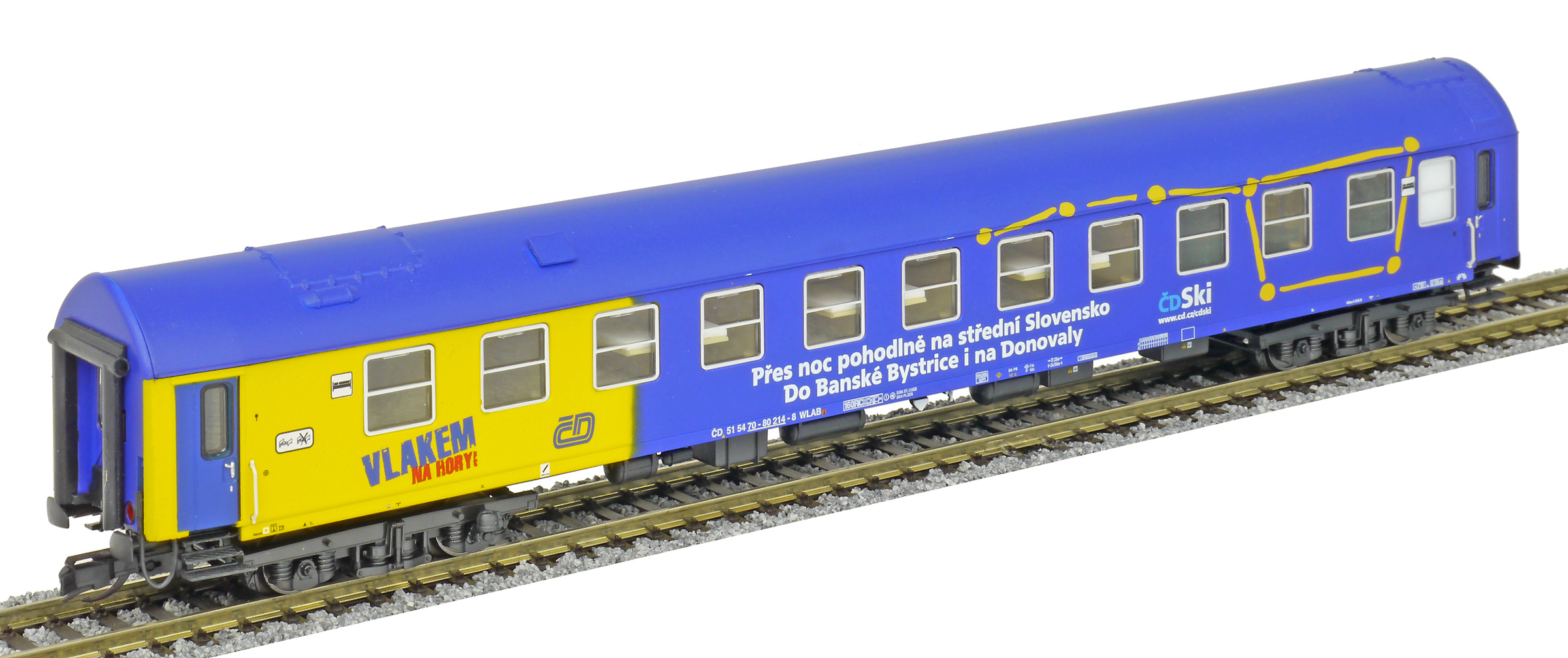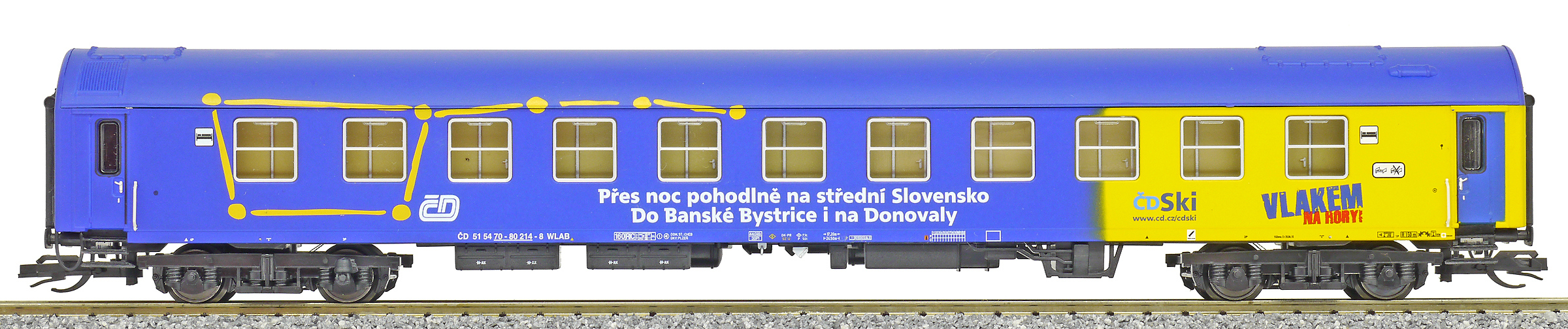 | lůžkový vůz modrý-žlutý s reklamním potiskem |