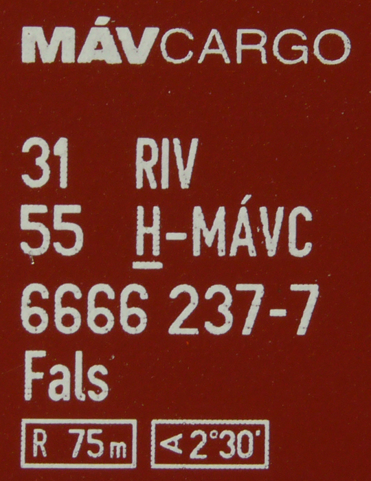 | • 31 55 666 6 237-7 | → | nákladní, s podvozky, pevný rozchod, ve vlastnictví železniční správy, RIV, PPV |