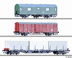 | nákladní plošinový vůz černý se třemi bílými kontejnery |