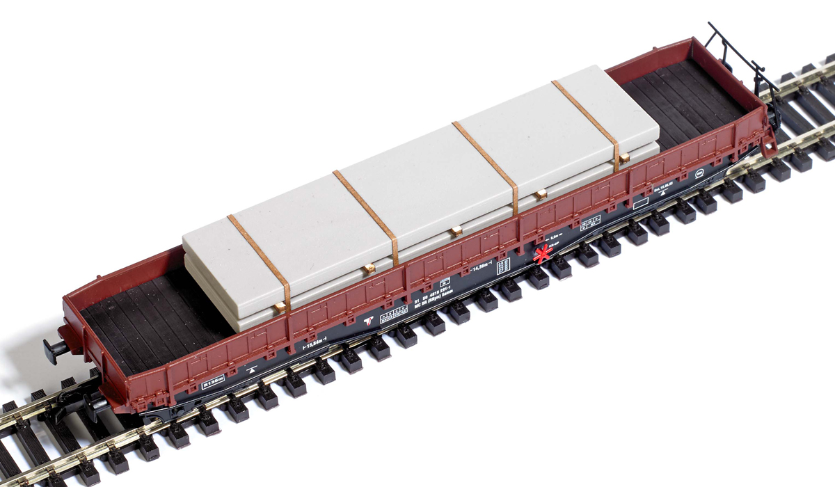 | nízkostěnný nákladní vůz červenohnědý s černým rámem a s nákladem betonových desek |