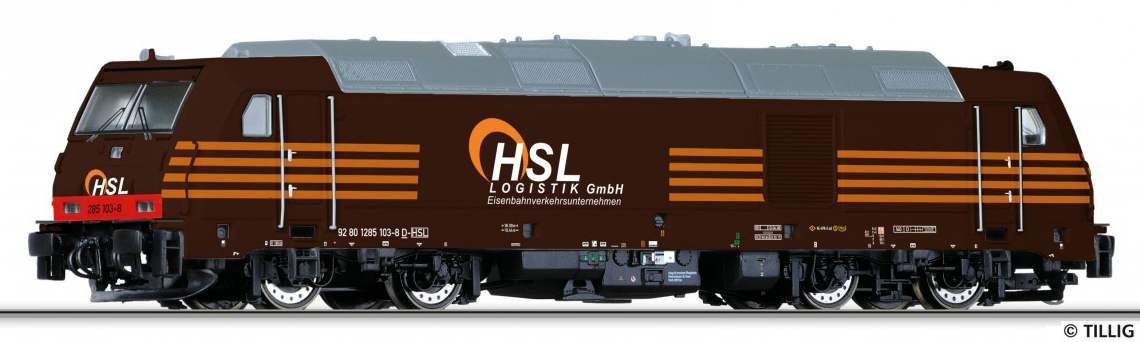 | dieselová lokomotiva hnědá s šedou střechou a logem „HSL Logistik GmbH“ |