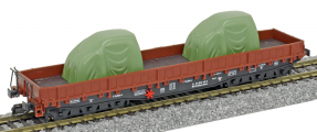 | nízkostěnný červenohnědý vůz s nákladem dvou zaplachtovaných strojů |