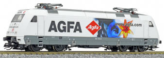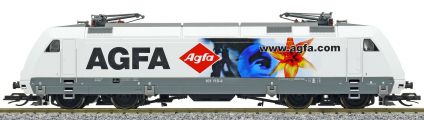 Popis   elektrická lokomotiva bílá s šedým rámem a reklamním potiskem „AGFA“