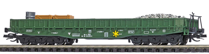 | nízkostěnný nákladní vůz zelený do stavebního vlaku s nákladem materiálu |