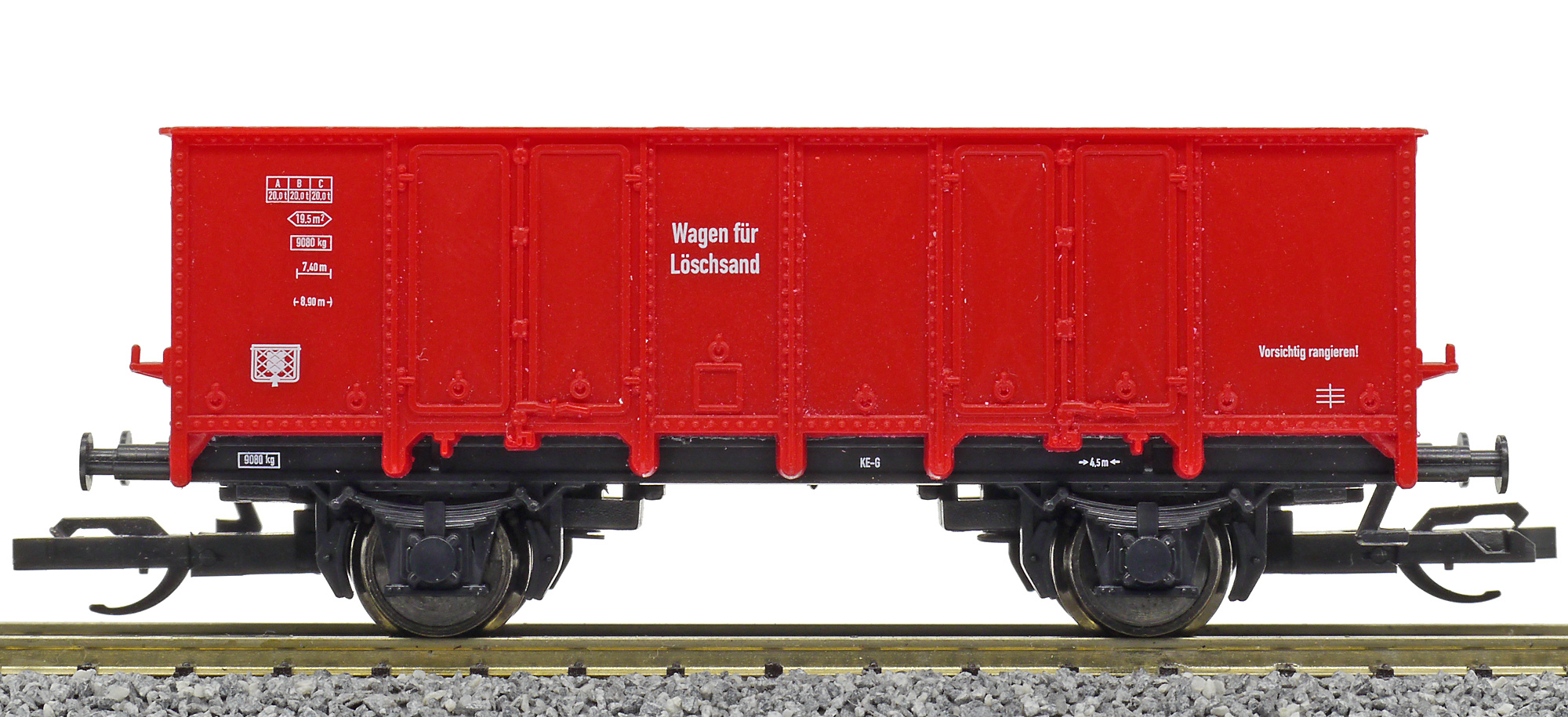 Popis   otevřený vůz červený s nákladem písku do požárního vlaku