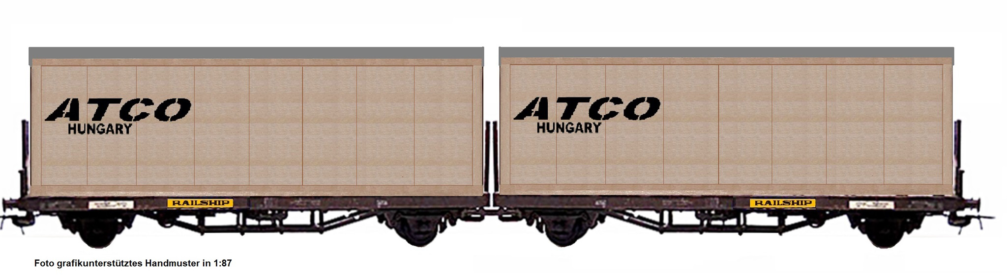 dvojdílný plošinový nákladní vůz s nákladem beden s plachtou „ATCO“