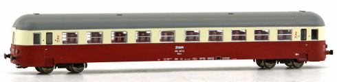 Popis   přívěsný vůz červený-krémový s šedou střechou
