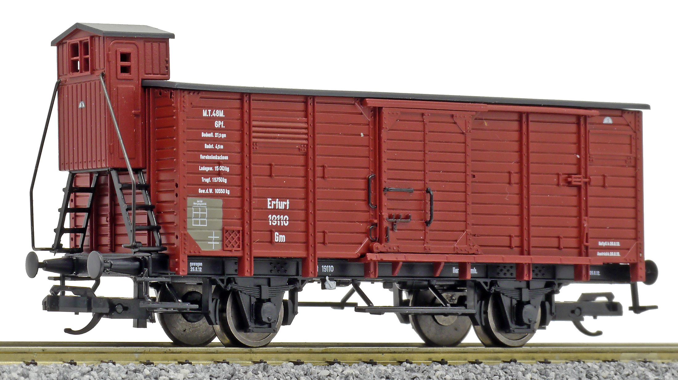 krytý nákladní vůz červenohnědý s černou střechou a s brzdařskou budkou