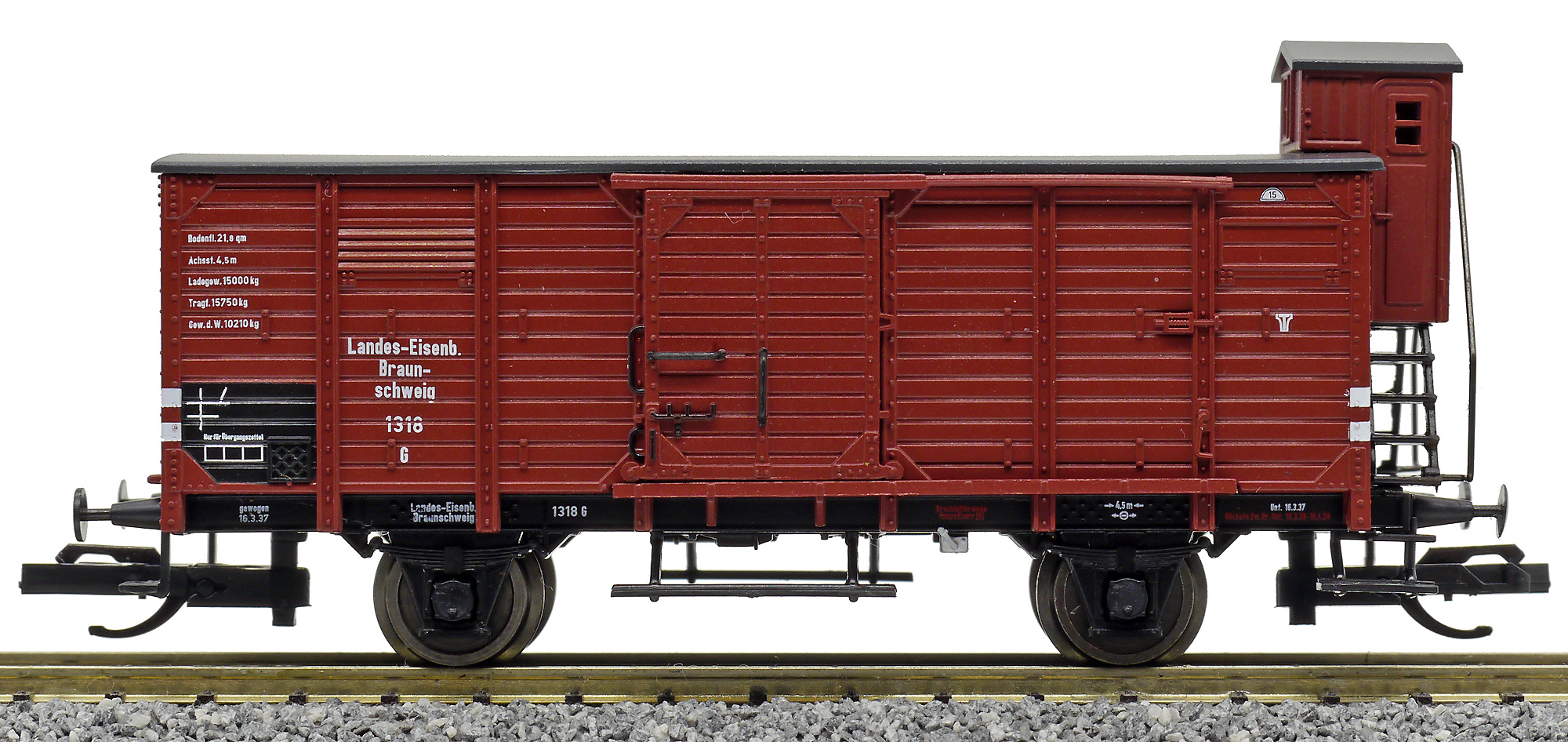 krytý nákladní vůz červenohnědý s černou střechou a s brzdařskou budkou
