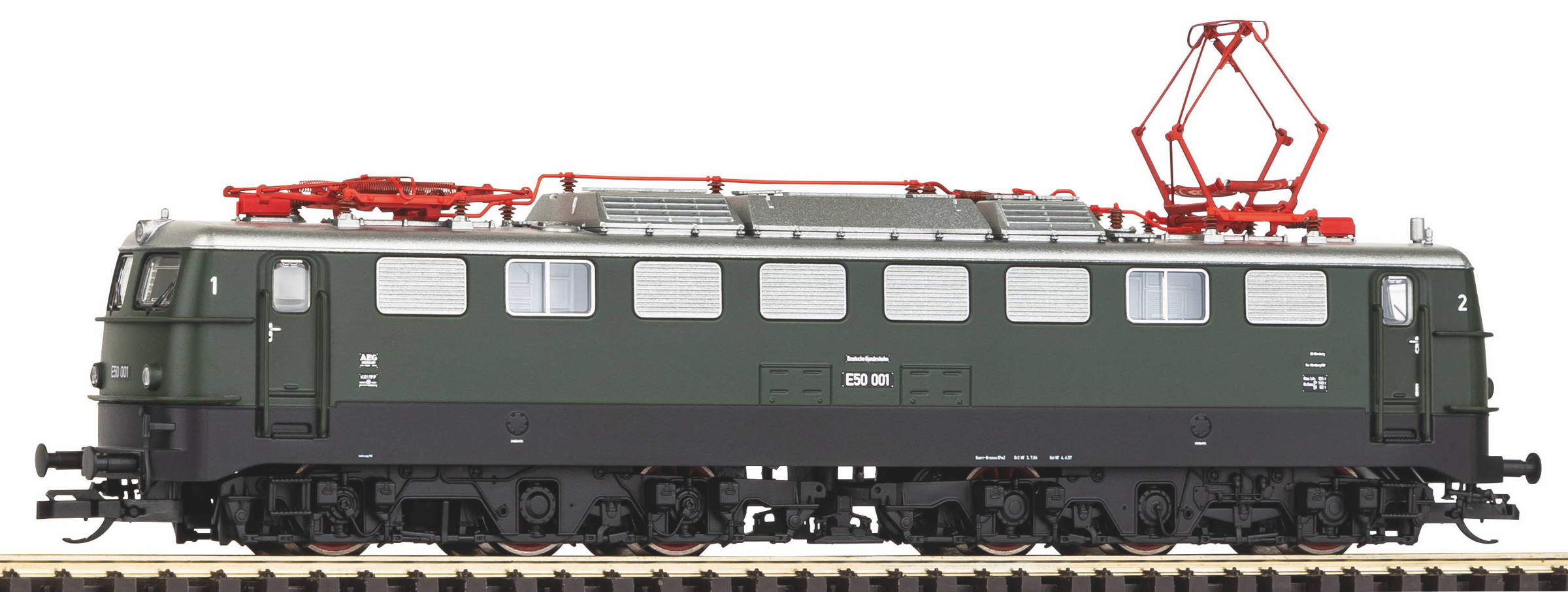 | elektrická lokomotiva tmavě zelená s černým rámem, stříbrná střecha, červené pantografy |