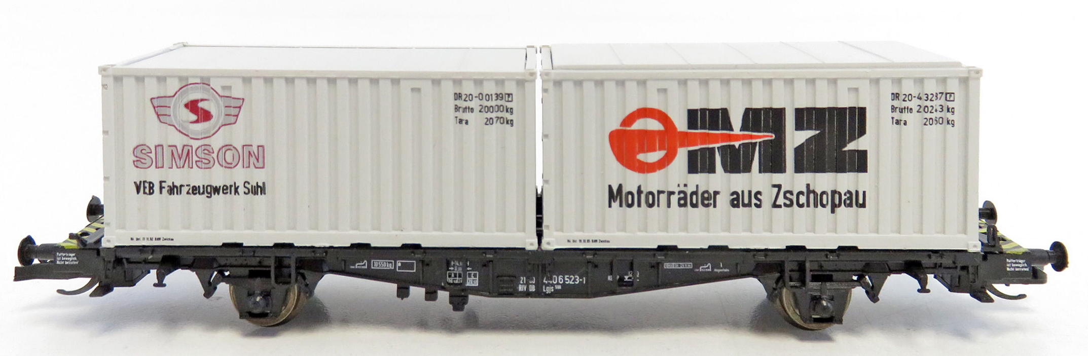 | plošinový nákladní vůz černý se dvěma kontejnery 20' „Simson“ a „MZ“ |