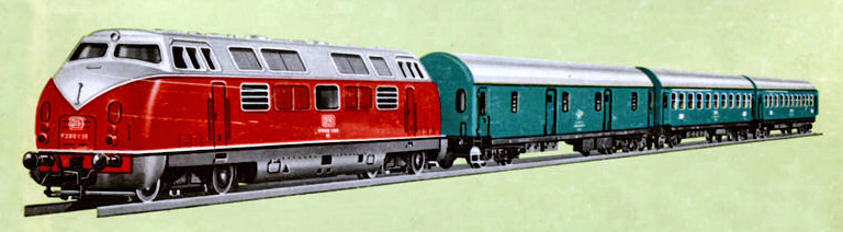 | set dieselové lokomotivy V 200 a tří rychlíkových vozů |