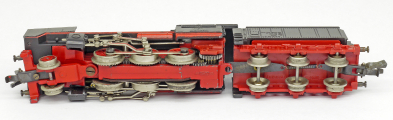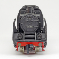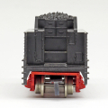 | parní lokomotiva černá s červeným pojezdem a s kouřovými plechy |