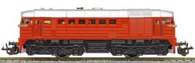 | dieselová lokomotiva červená v barvě plastu, stříbrná střecha a černá imitace pojezdu |