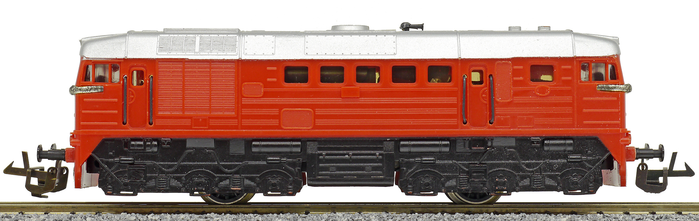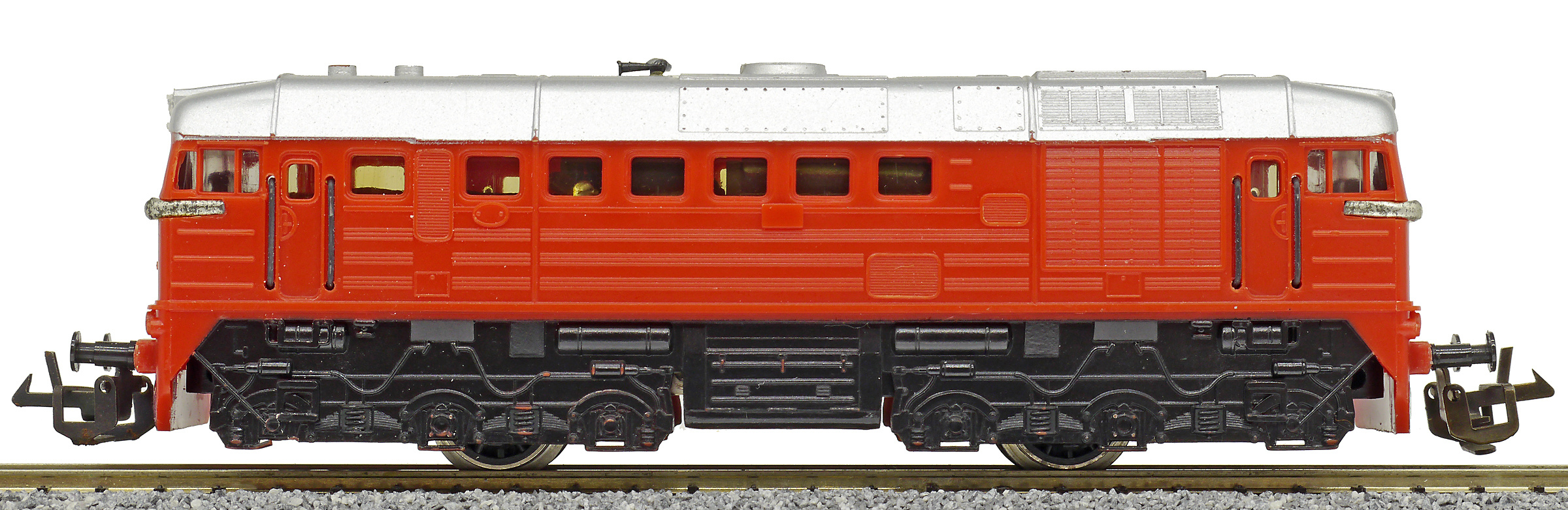 | dieselová lokomotiva červená v barvě plastu, stříbrná střecha a černá imitace pojezdu |