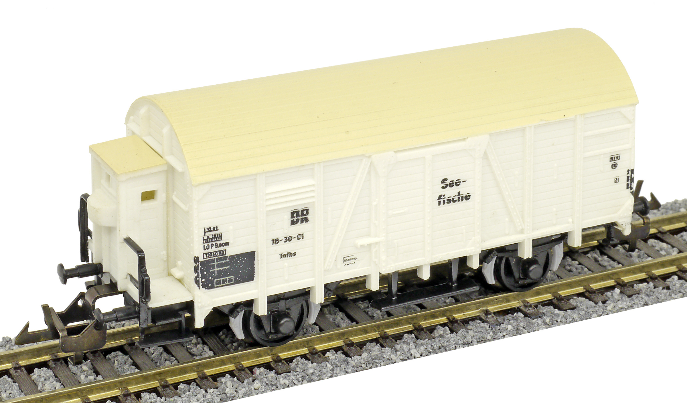 | nákladní chladící vůz bílý s krémovou střechou a s brzdařskou budkou na přepravu ryb „Seefische“ |