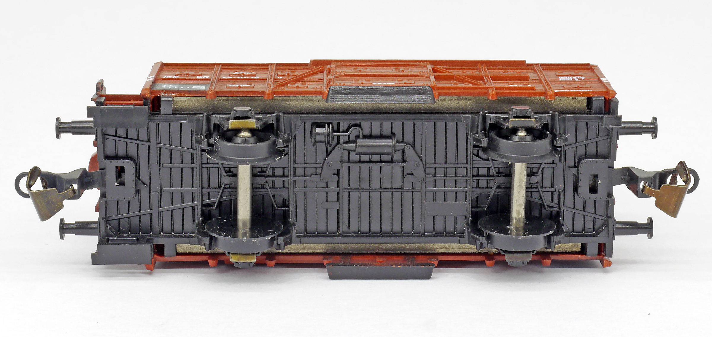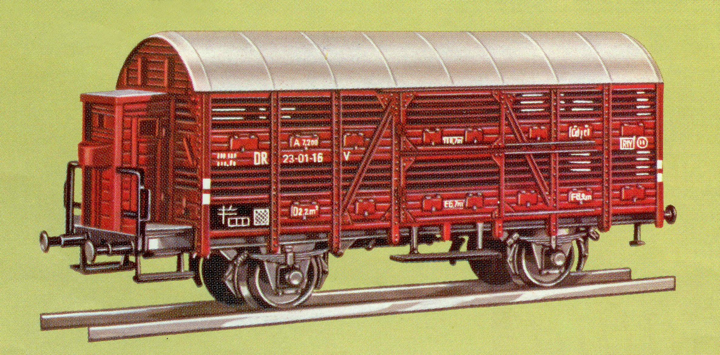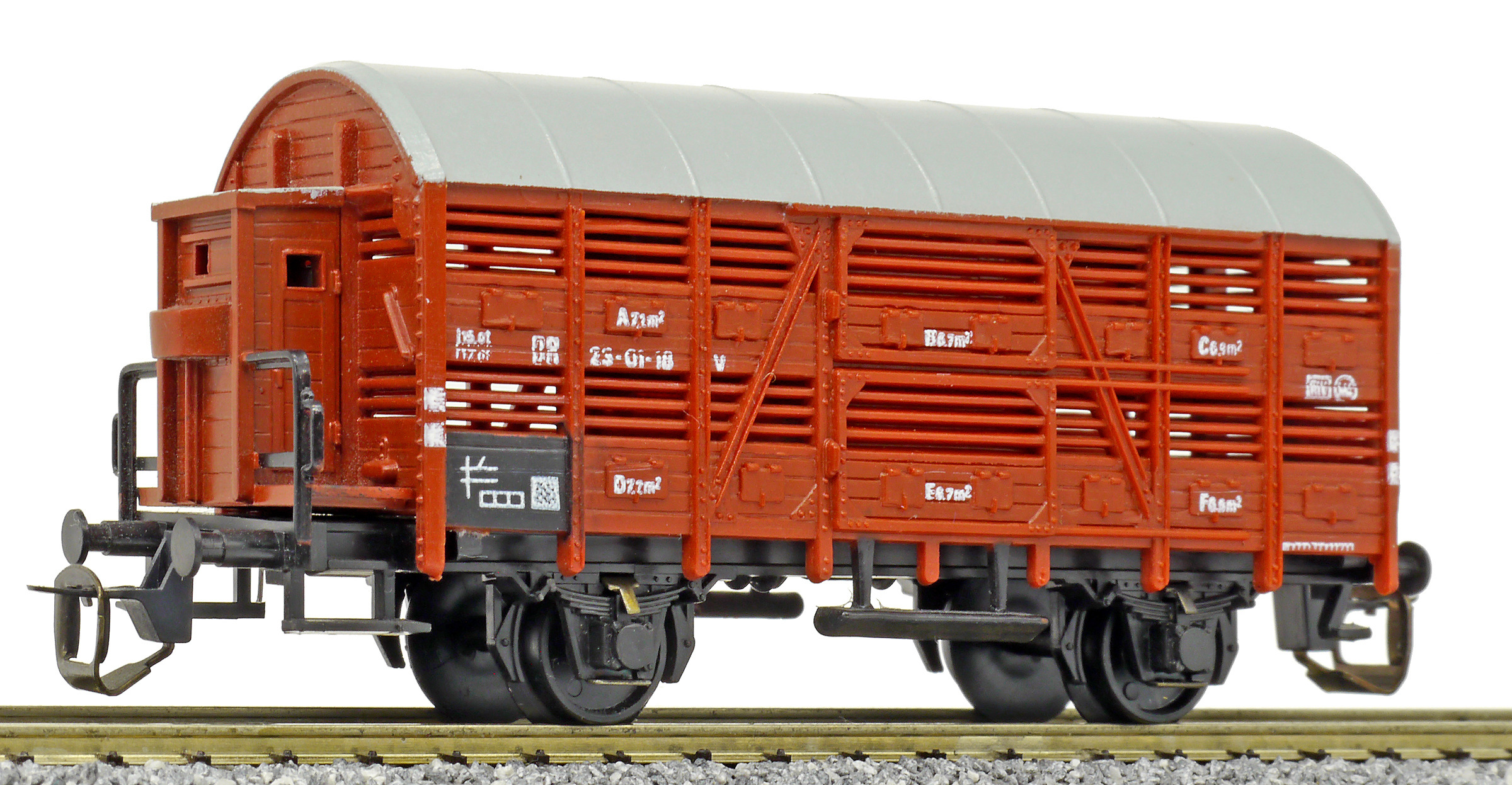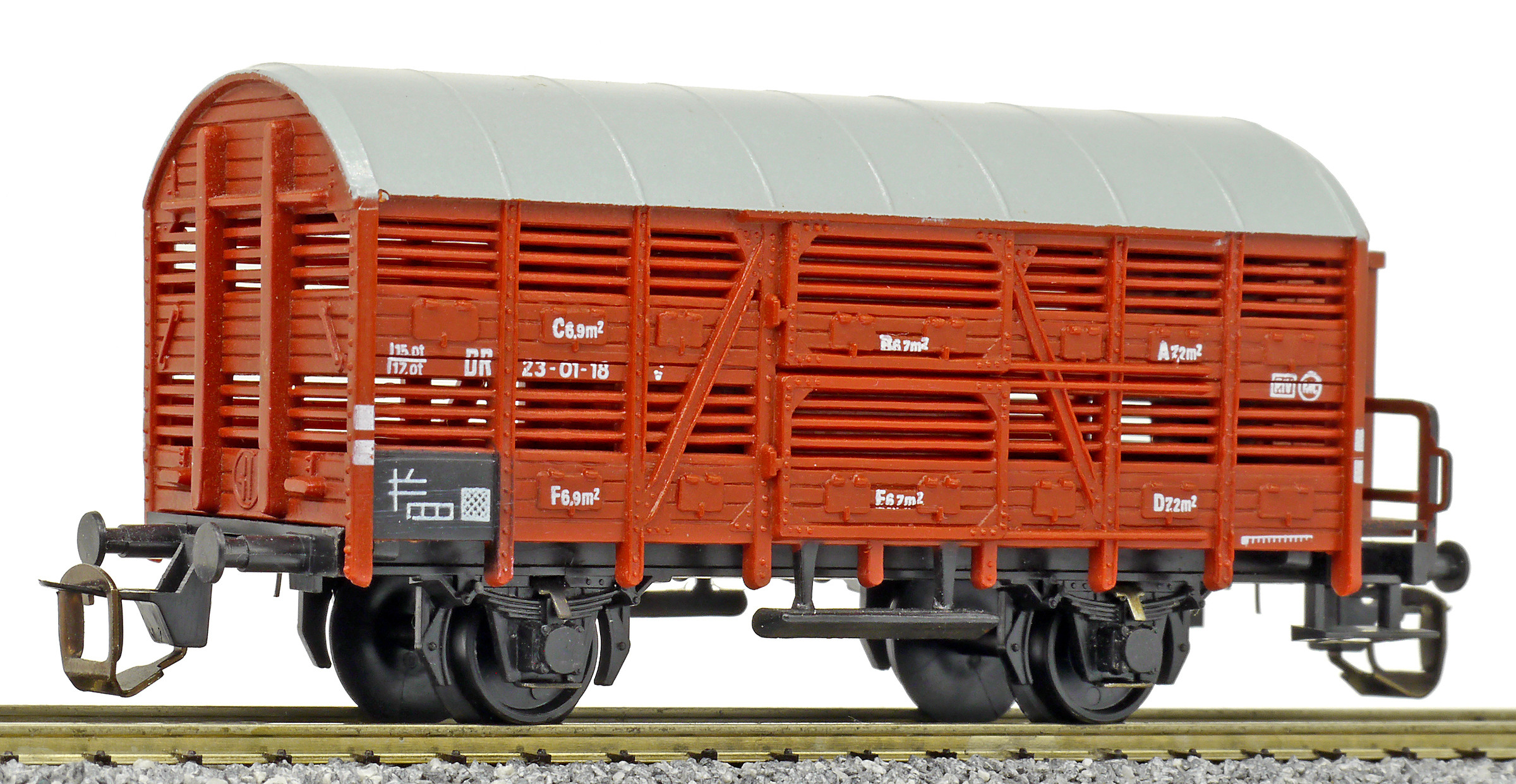 nákladní vůz na přepravu zvířat červenohnědý s šedou střechou a s brzdařskou budkou