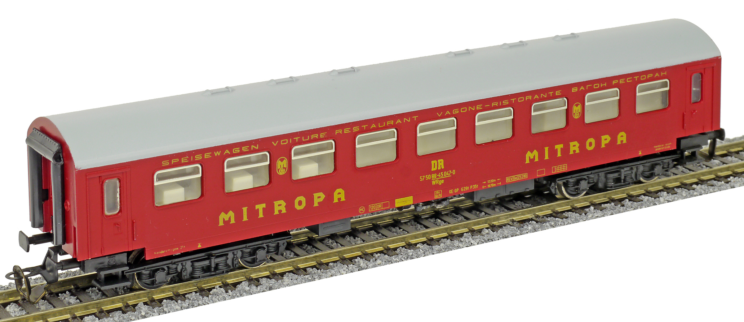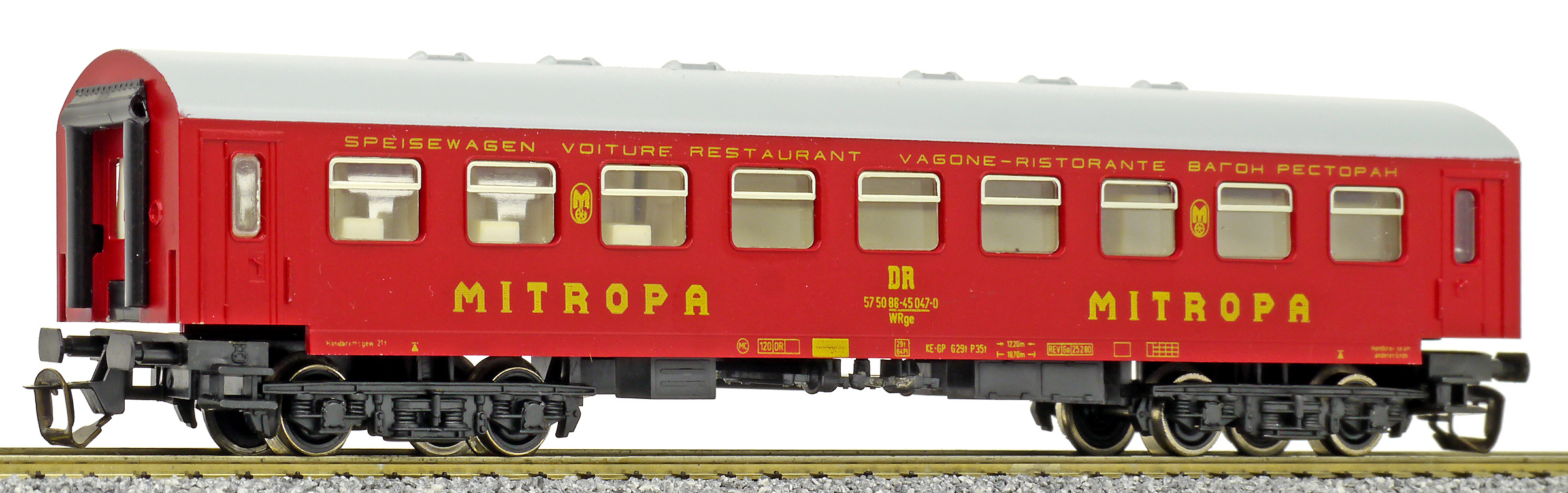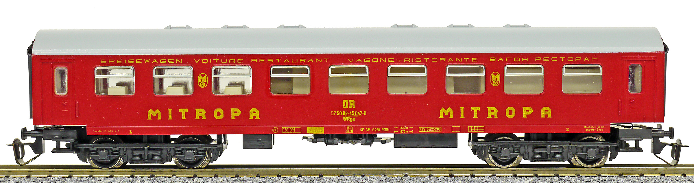 | jídelní vůz červený s šedou střechou „MITROPA“ |