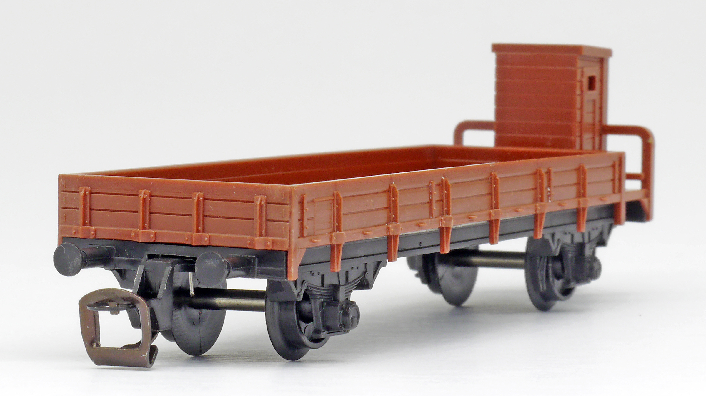 | nízkostěnný nákladní vůz červenohnědý s brzdařskou budkou |