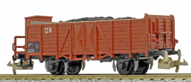 | otevřený nákladní vůz červenohnědý s brzdařskou budkou ložený uhlím |