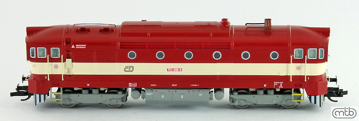 Popis   dieselová lokomotiva vínově červená s krémovým pásem, šedé podvozky