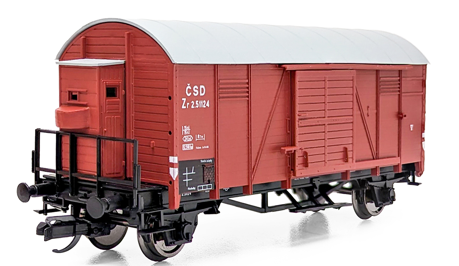 | krytý nákladní vůz červenohnědý s šedou střechou a s brzdařskou budkou |