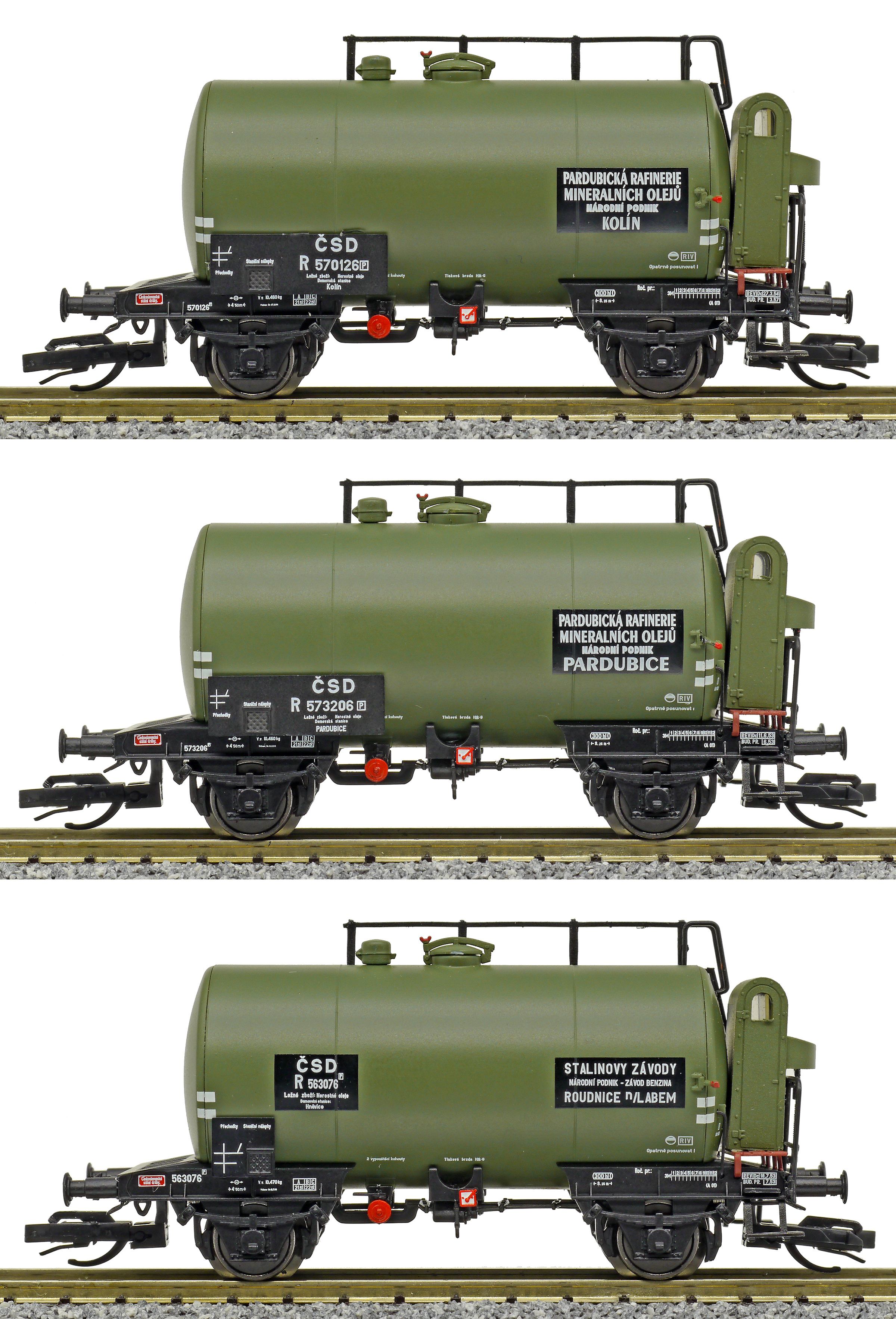 | set tří zelených kotlových vozů s brzdařskými budkami |