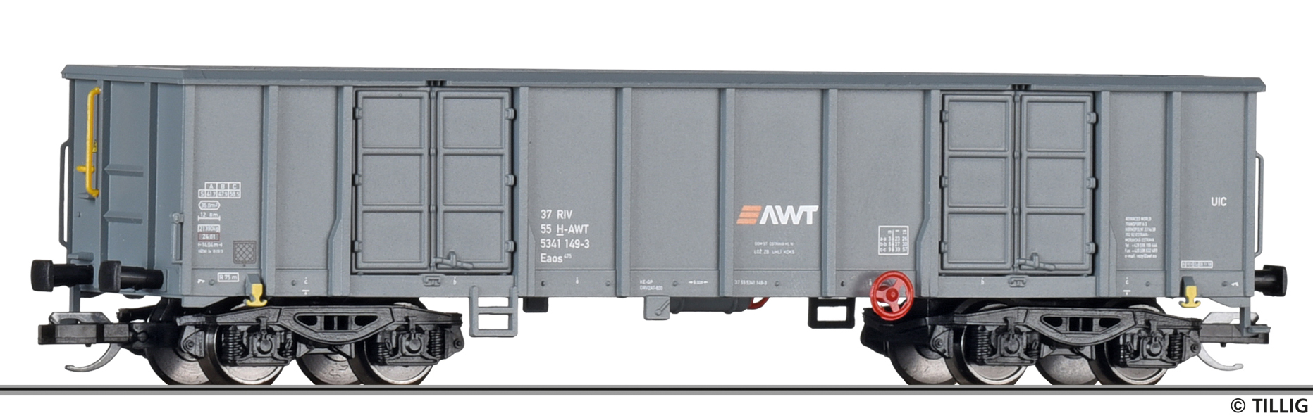 | vysokostěnný nákladní vůz šedý s logem „AWT“ |
