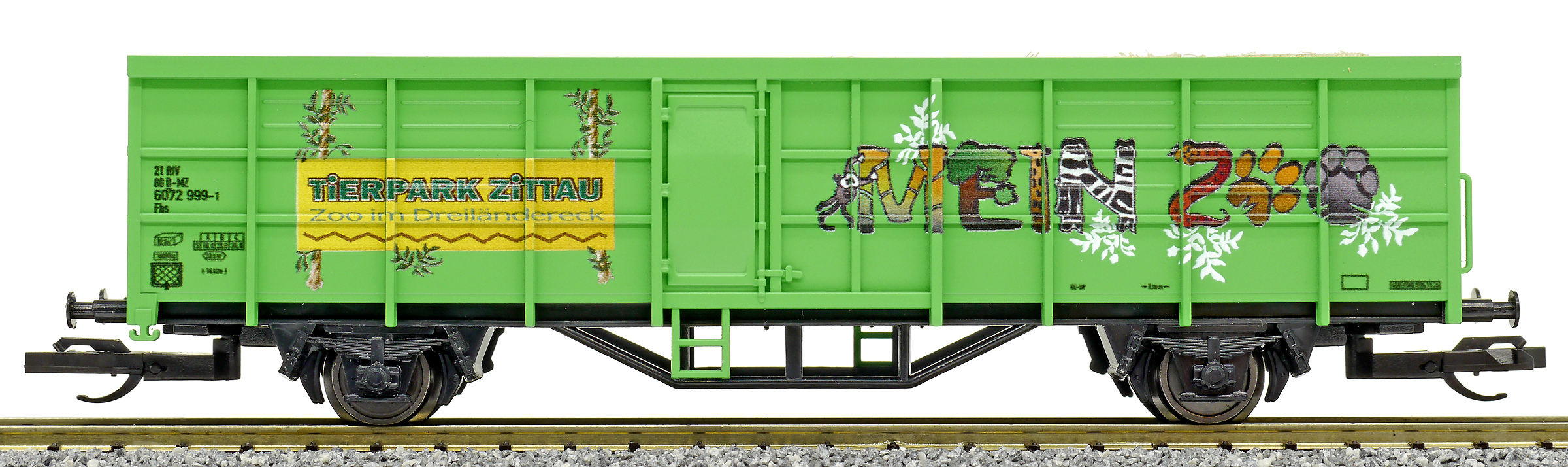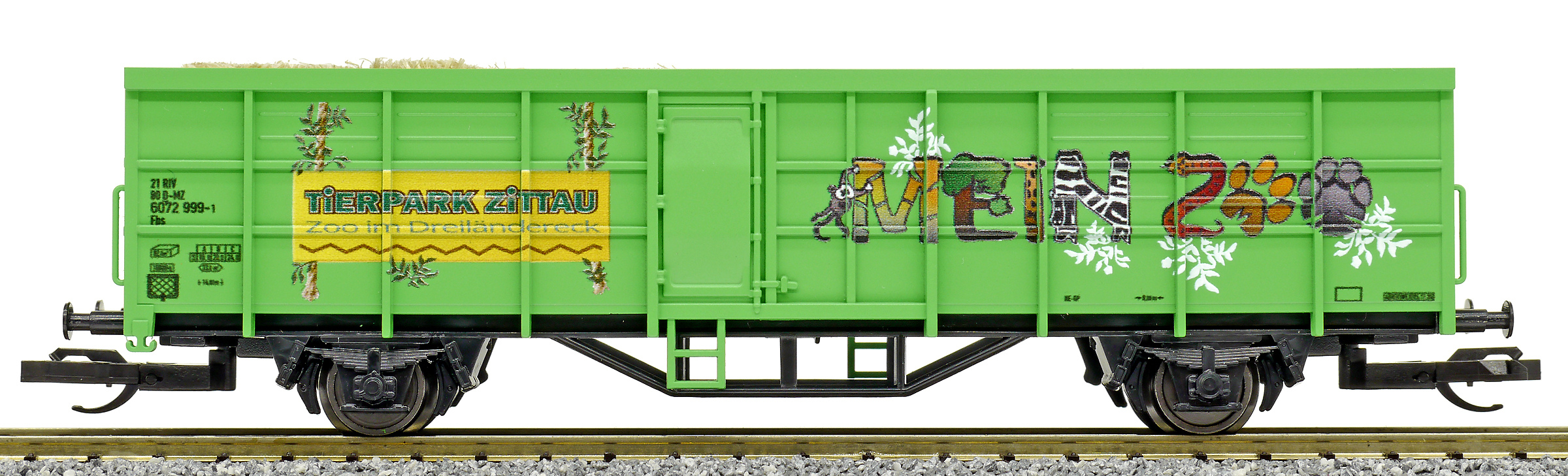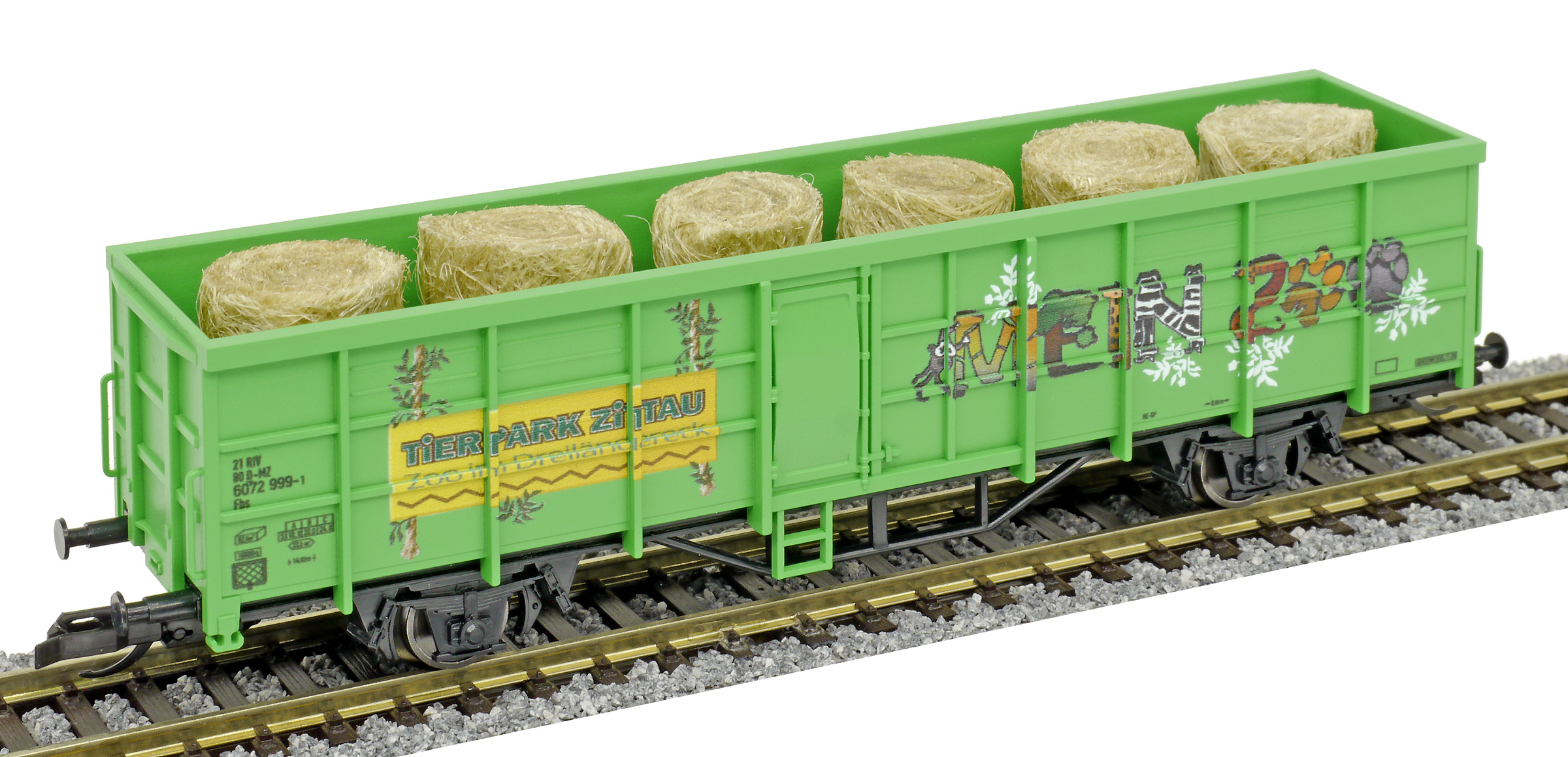 | otevřený nákladní vůz zelený „Mein Zoo“ s nákladem balíků sena |