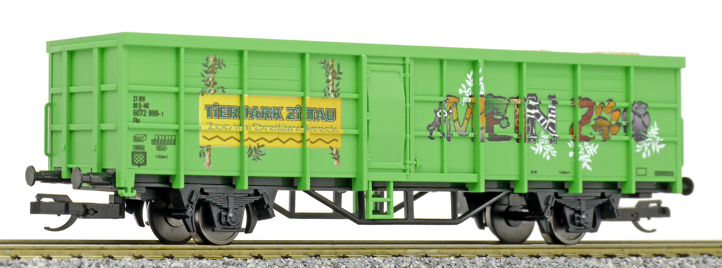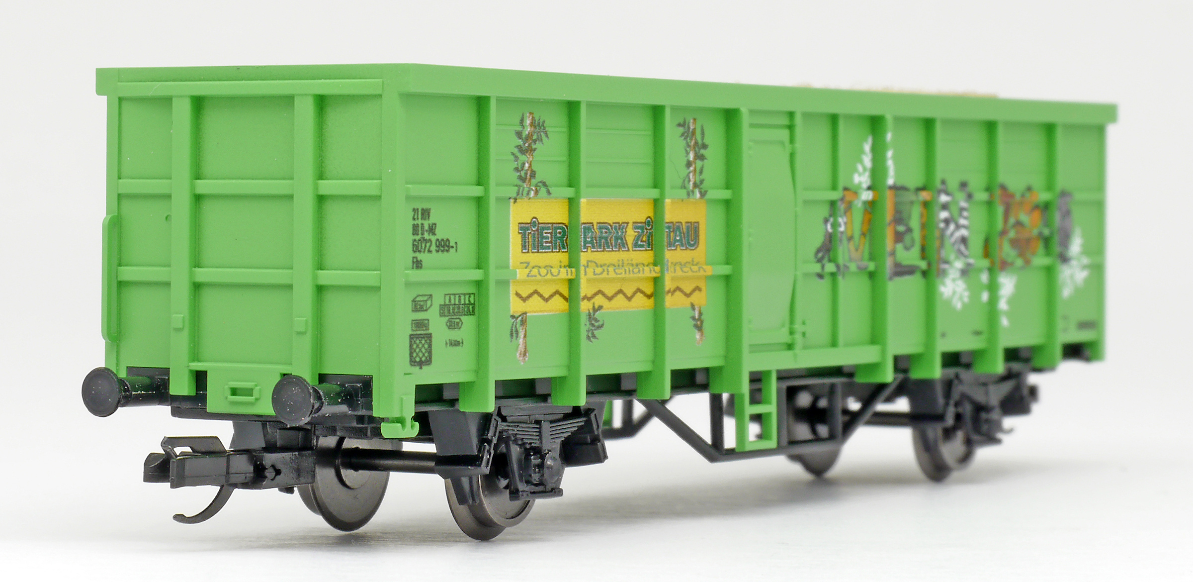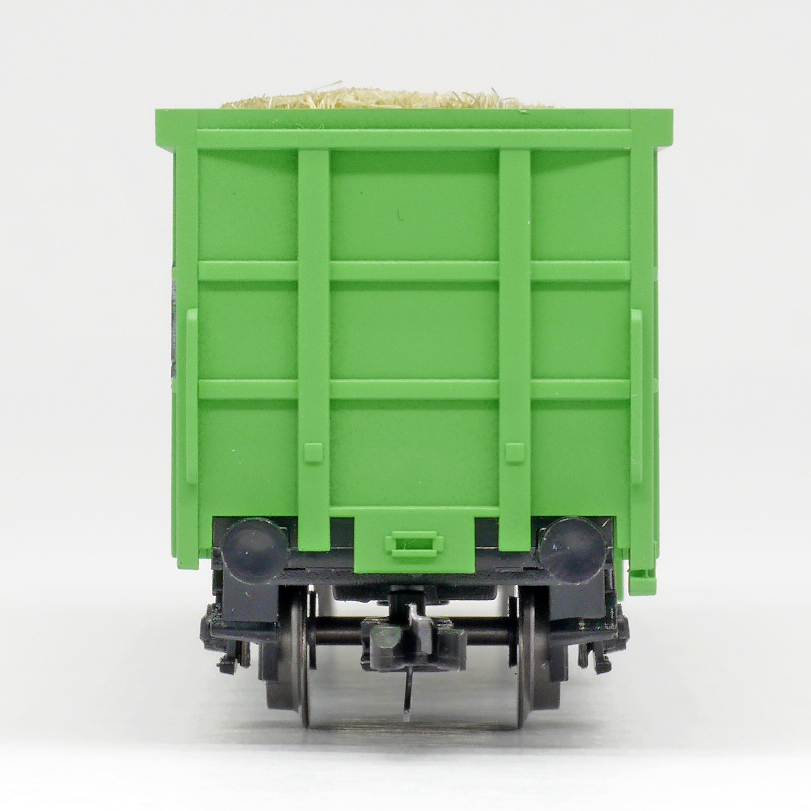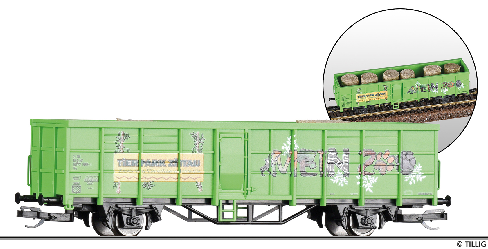 | otevřený nákladní vůz zelený „Mein Zoo“ s nákladem balíků sena |