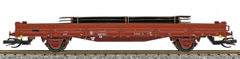 | nízkostěnný nákladní vůz červenohnědý s klanicemi s nákladem ocelových plechů |