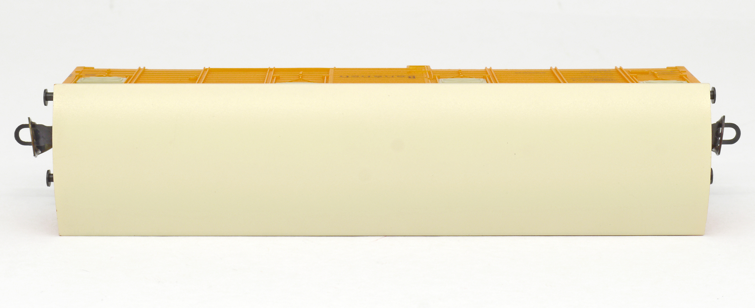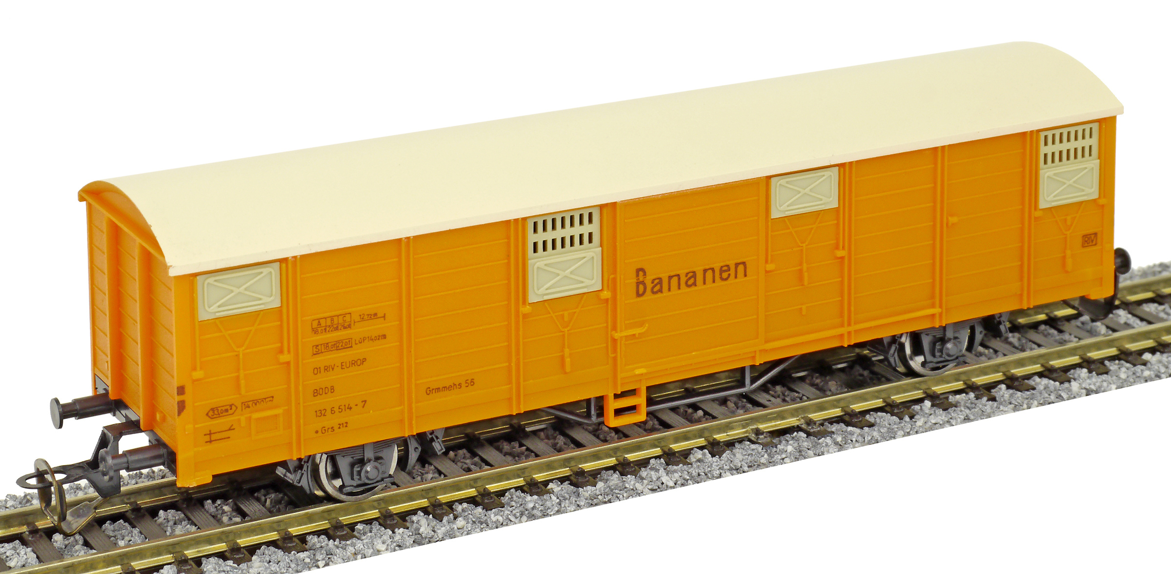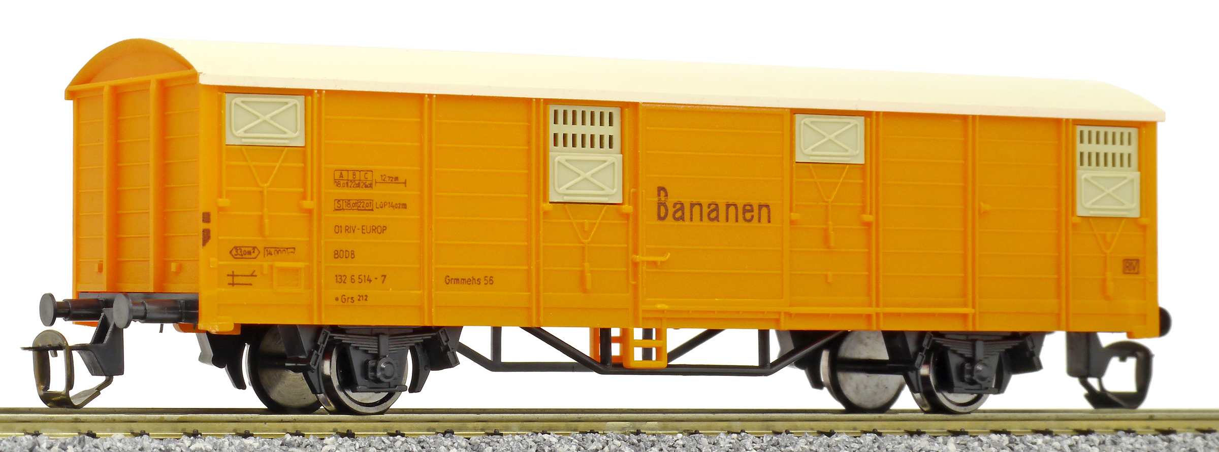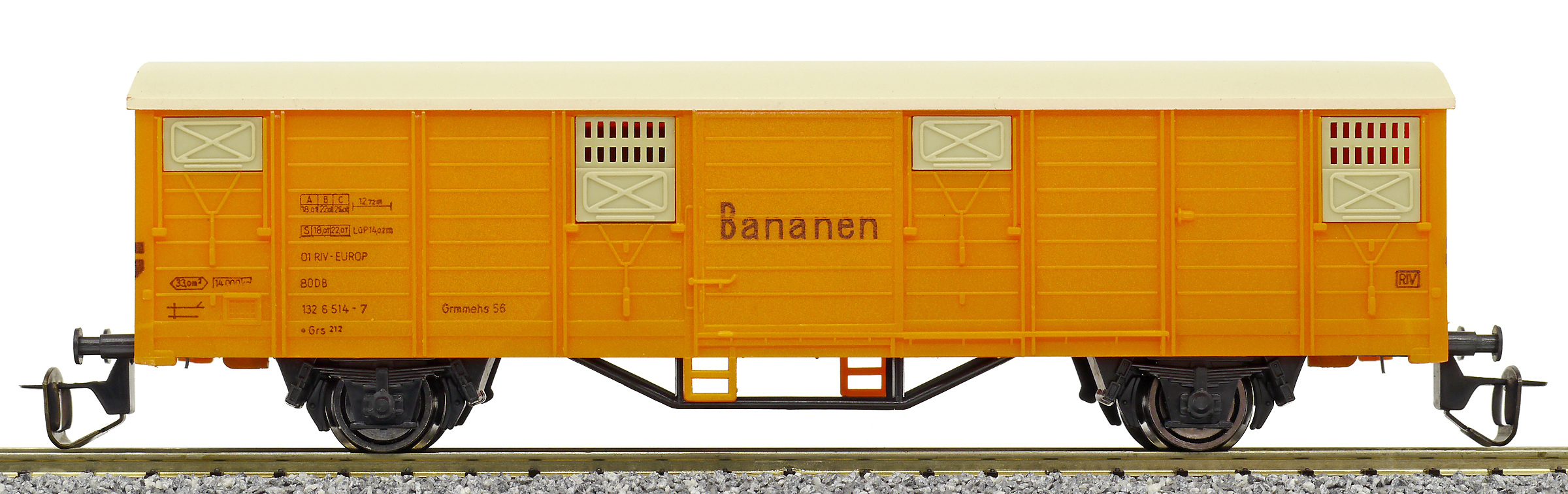 | krytý nákladní vůz oranžový s krémovou střechou a s oranžovými vraty „Bananen“ |