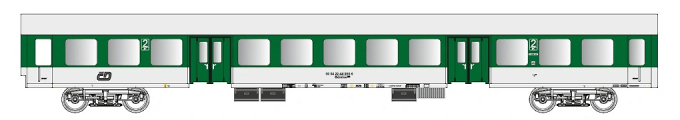 | rychlíkový vůz zelený-bílý se světle šedou střechou 2. tř. |