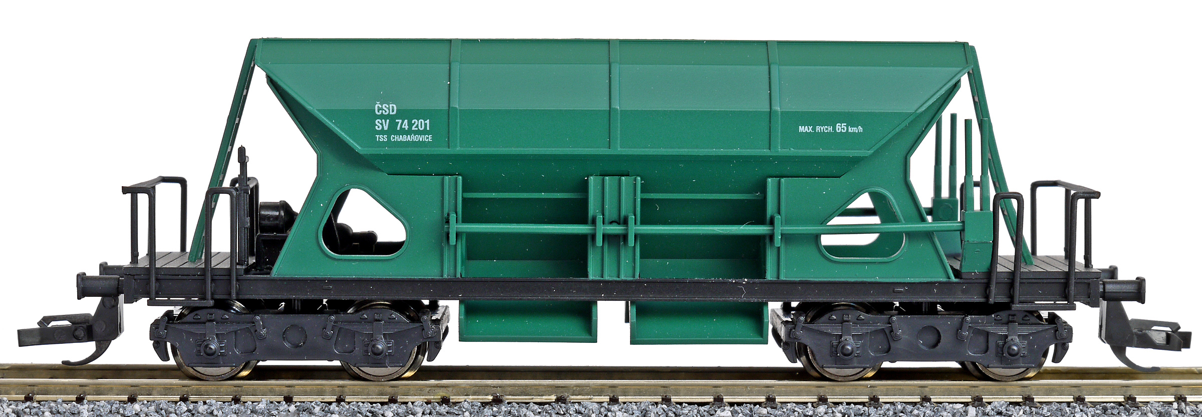 nákladní samovýsypný vůz zelený s černým rámem a s nákladem štěrku