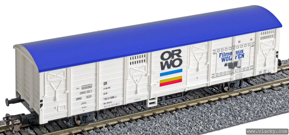 | krytý nákladní vůz bílý s modrou střechou „ORWO“ |