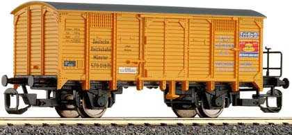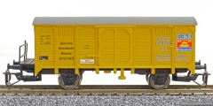 krytý nákladní vůz žlutý s šedou střechou a brzdařskou plošinou „Homann“
