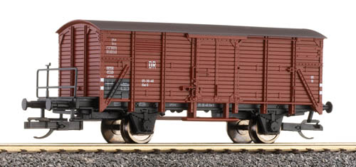 krytý nákladní vůz červenohnědý s tmavou střechou a brzdařskou plošinou