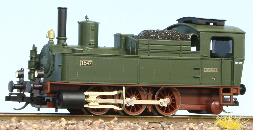 parní lokomotiva tmavě zelená s tamvě červeným pojezdem
